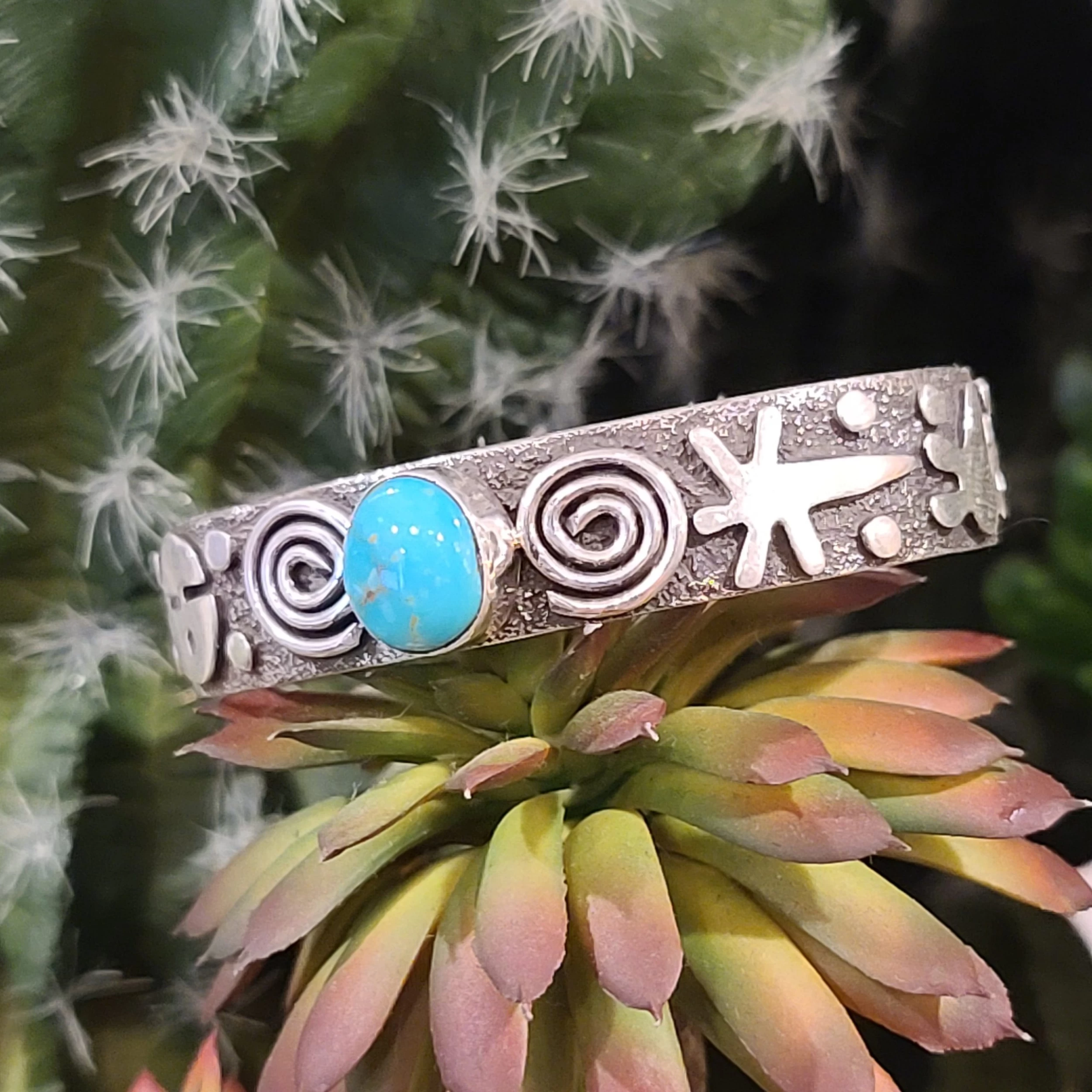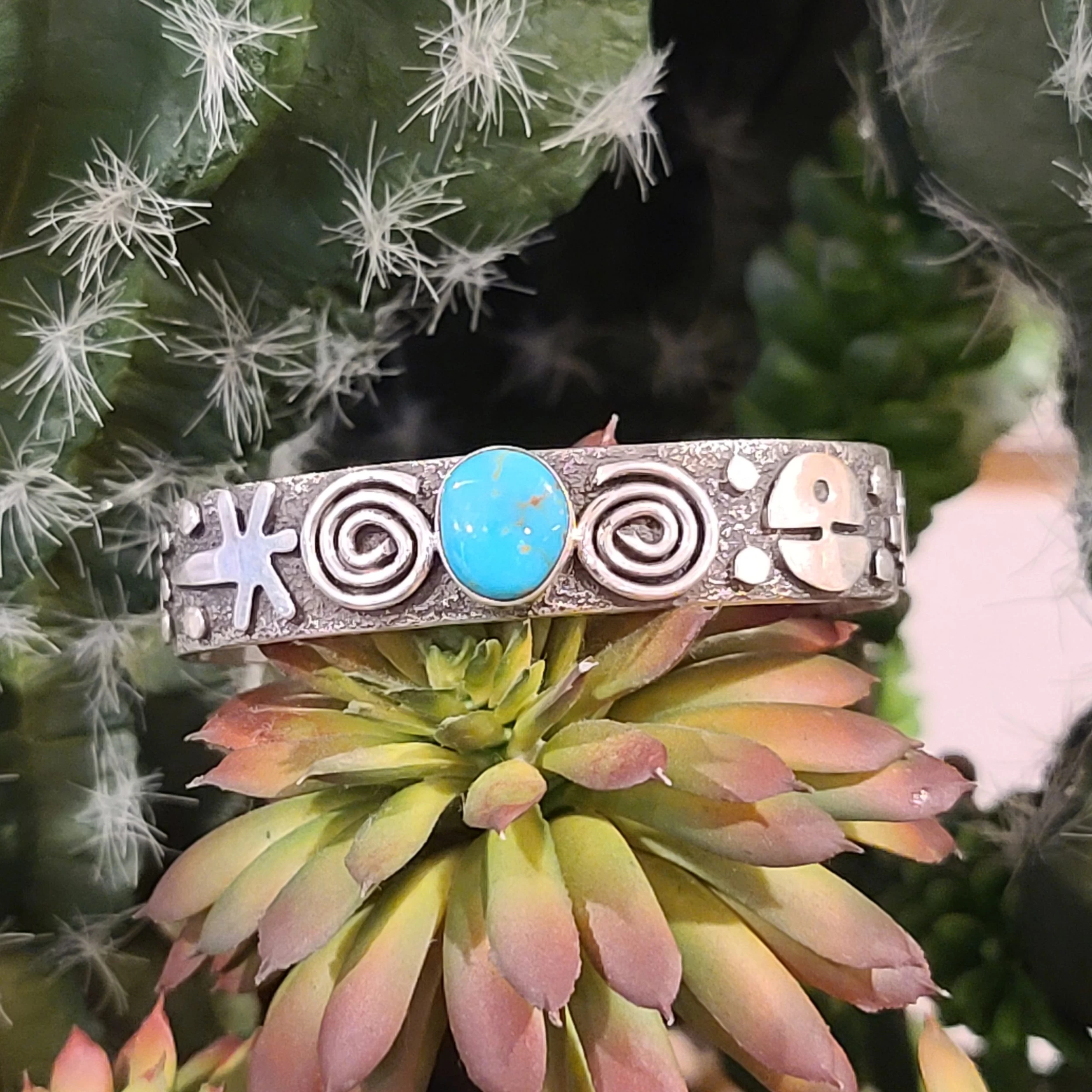 This is a beautiful Alex Sanchez cuff. The Turquoise used in this unique cuff is Royston. Alex Sanchez is known for his unique style and its shown beautifully on this piece.Â