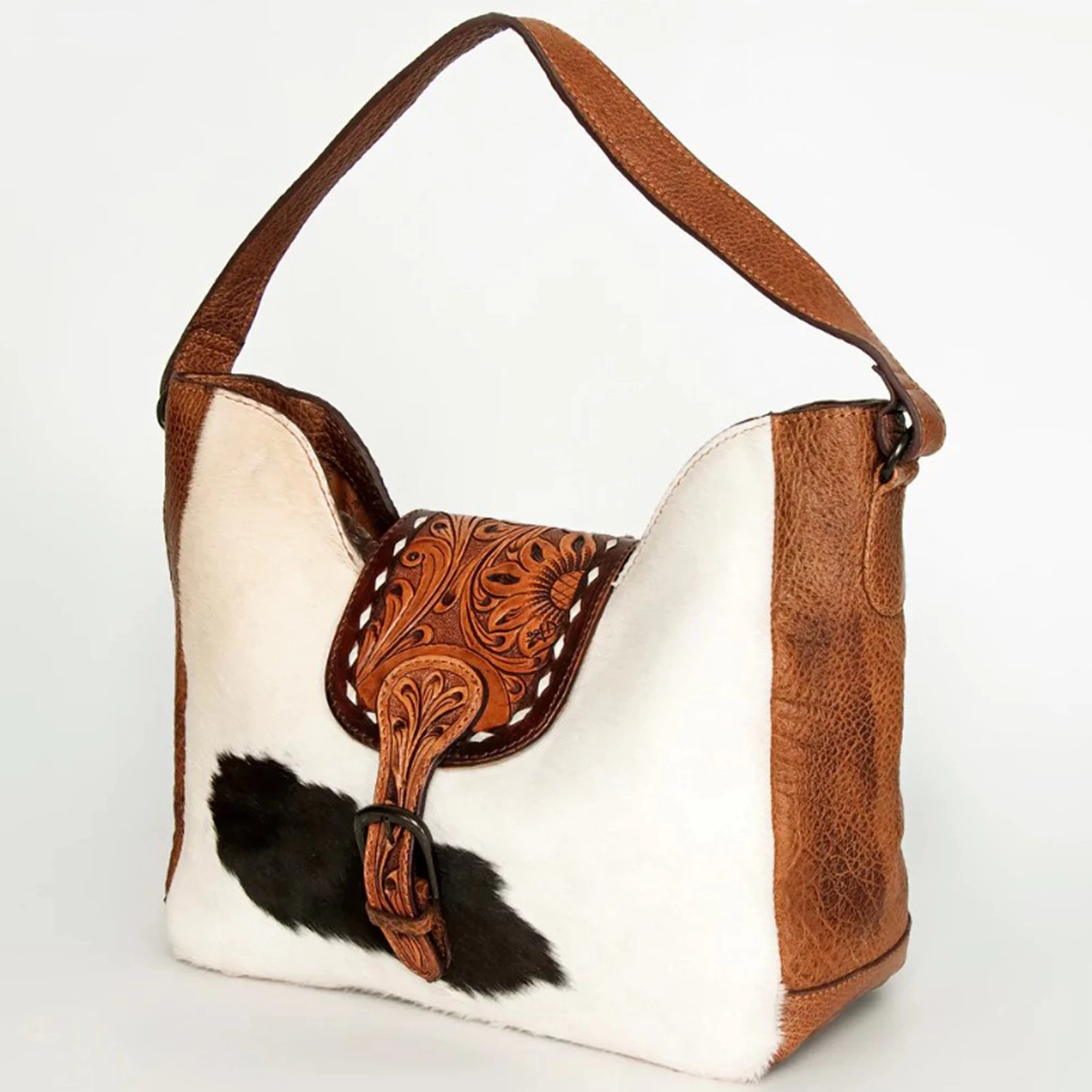 This beautiful bomber leather & Cowhide shoulder bag is soft and durable. Great for an everyday bag.Â
