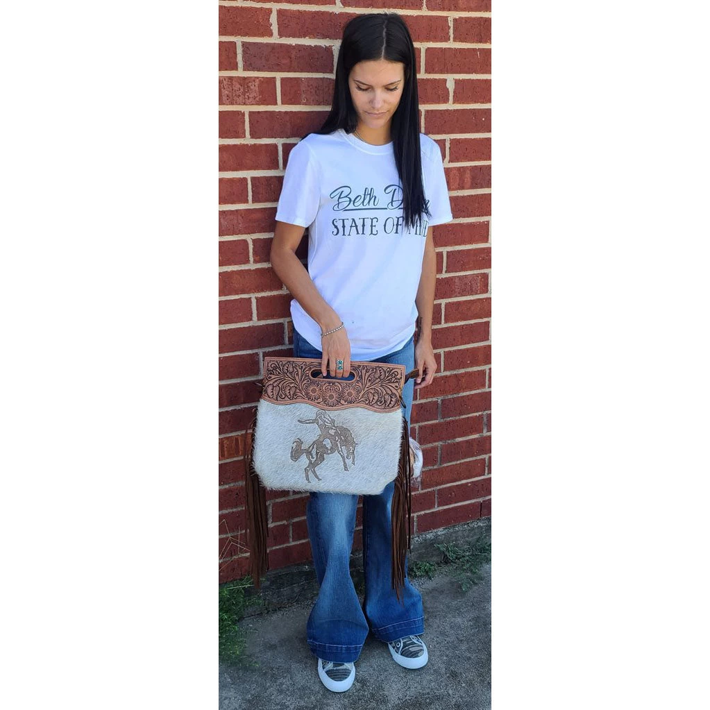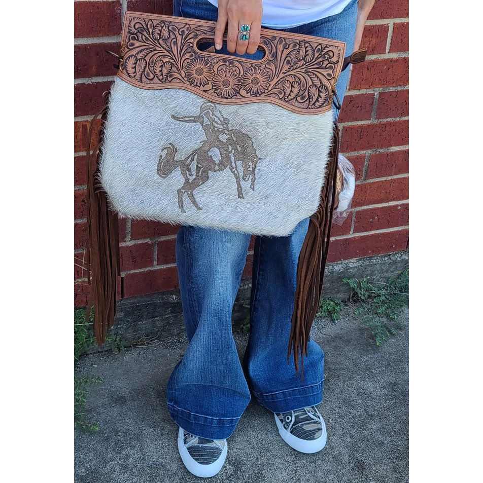 This bronc cowhide clutch comes with adjustable straps so you can carry it as a crossbody as well. Wherever my bronc lovers are you need this purse, it is so fun!Â