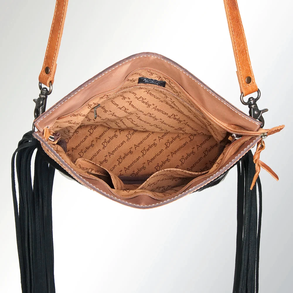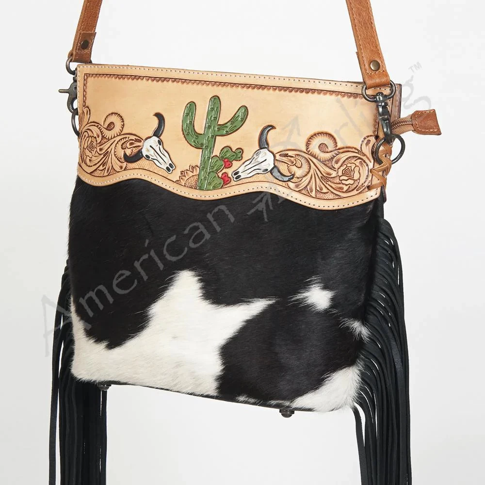 This cute cowhide and leather painted purse from American Darling is one of a kind. The leather work is beautiful. Don’t you just love the added fringe?