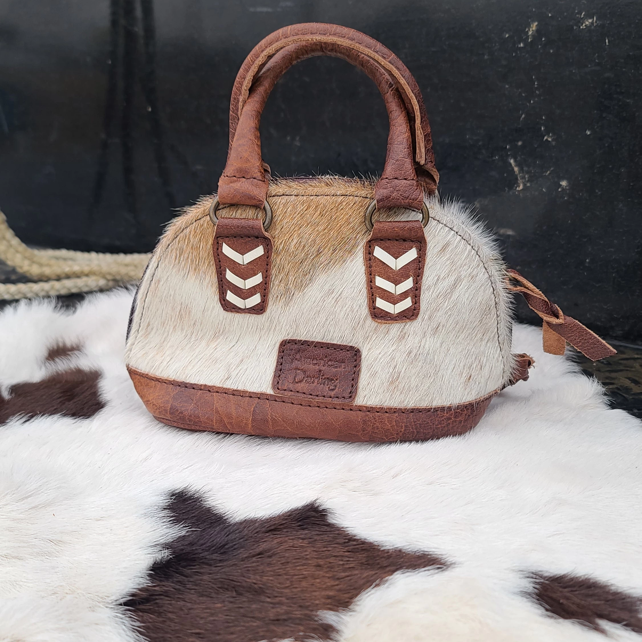 This mini cowhide bag is perfect accessory for your little cowgirl. It is 5 inches tall, 6 inches wide, and 3.5 inches deep.Â