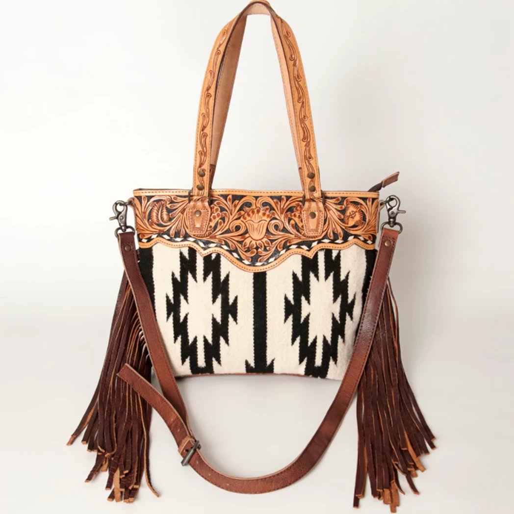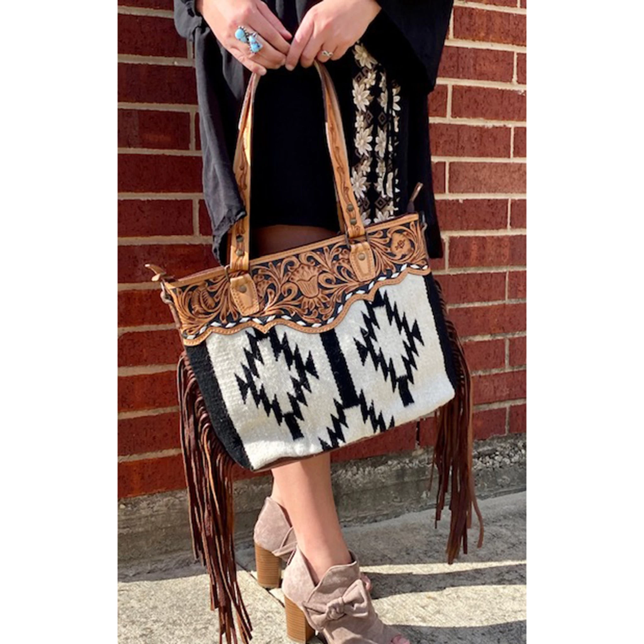 Okay!! This purse is absolutely stunning! Black & White Saddle Blanket with floral tooling, buckstitching, and fringe detail. It also comes with a removable shoulder strap. This purse is classy and is sure to turn heads anywhere you go!