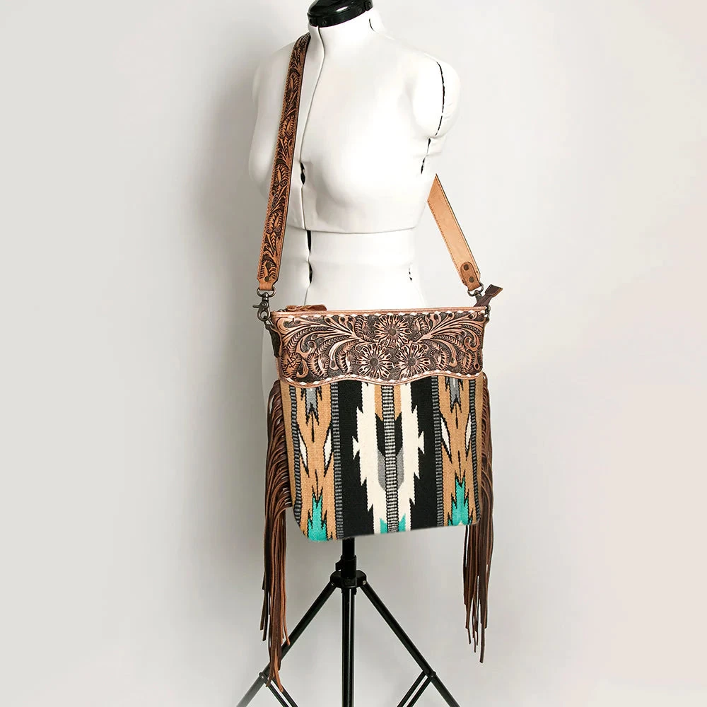 This purse is so beautiful! It’s tooled leather floral pattern & tan saddle blanket make it a great bag to carry all of the time! Not only can you fit everything you need in it, but you will also get compliments everywhere you go!