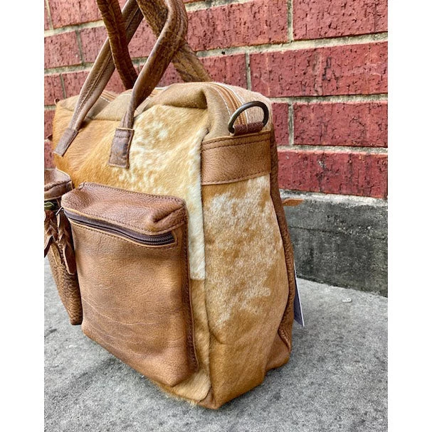 This gorgeous cowhide and bomber duffel is perfect for anyone that is on the go. Travel in style, western style that is, with this perfect duffel bag.Â