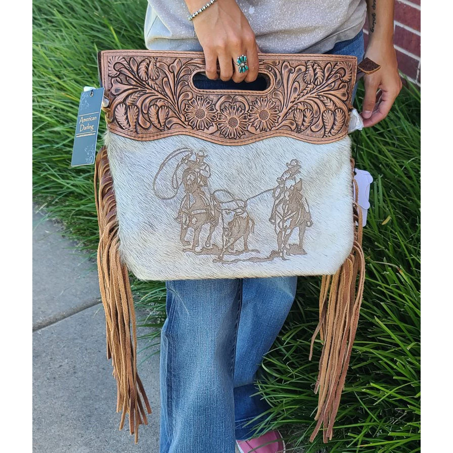 Where are my team roping lovers at? This purse is so unique and the perfect one for you. This purse comes with a leather strap, you can wear it as a crossbody or you can use it as a handbag.Â