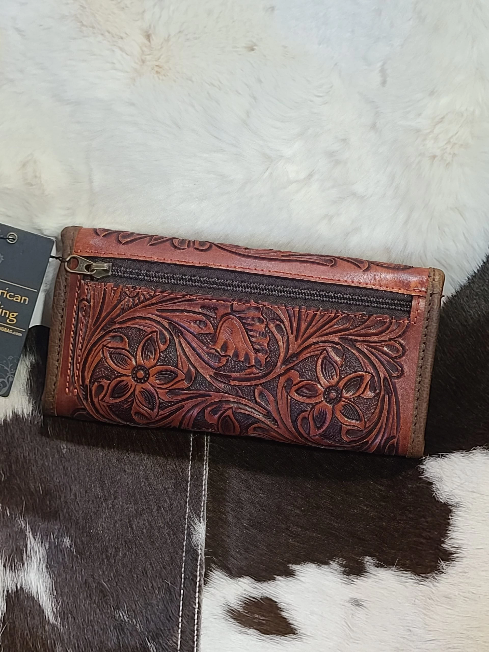 There is nothing much more beautiful than this fully tooled leather wallet! The floral pattern and dark dyed background are a timeless classic!Â