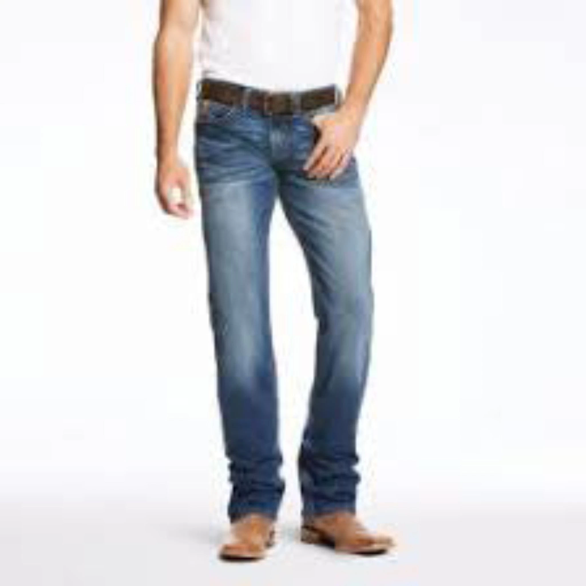 These jeans from Ariat features light blue and dark blue diamond pattern. They have a relaxed fit with a strait leg fit.