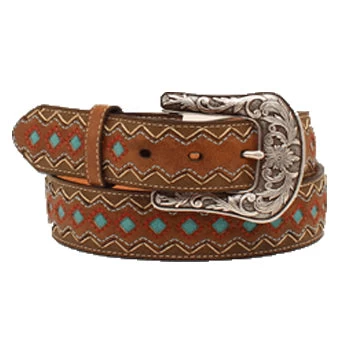 This trendy Ariat belt features a zig zag pattern with turquoise diamonds outlined in red stitching. Â Available in sizes small through x-large.