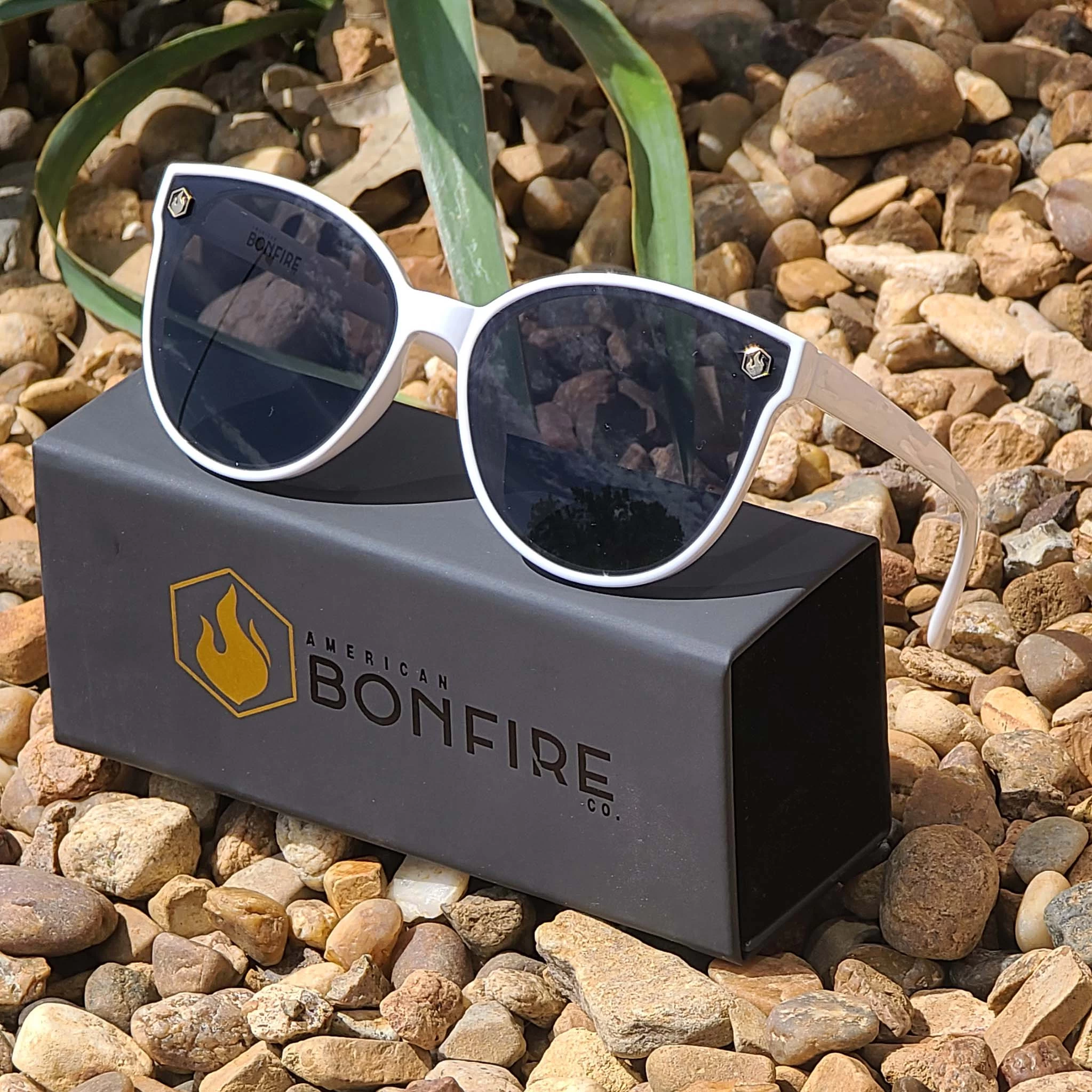 The Rockstar shades by Bonfire have a black lens & expand across the front of the frame and are highlighted by metal American Bonfire Co. insignias on the front lenses.