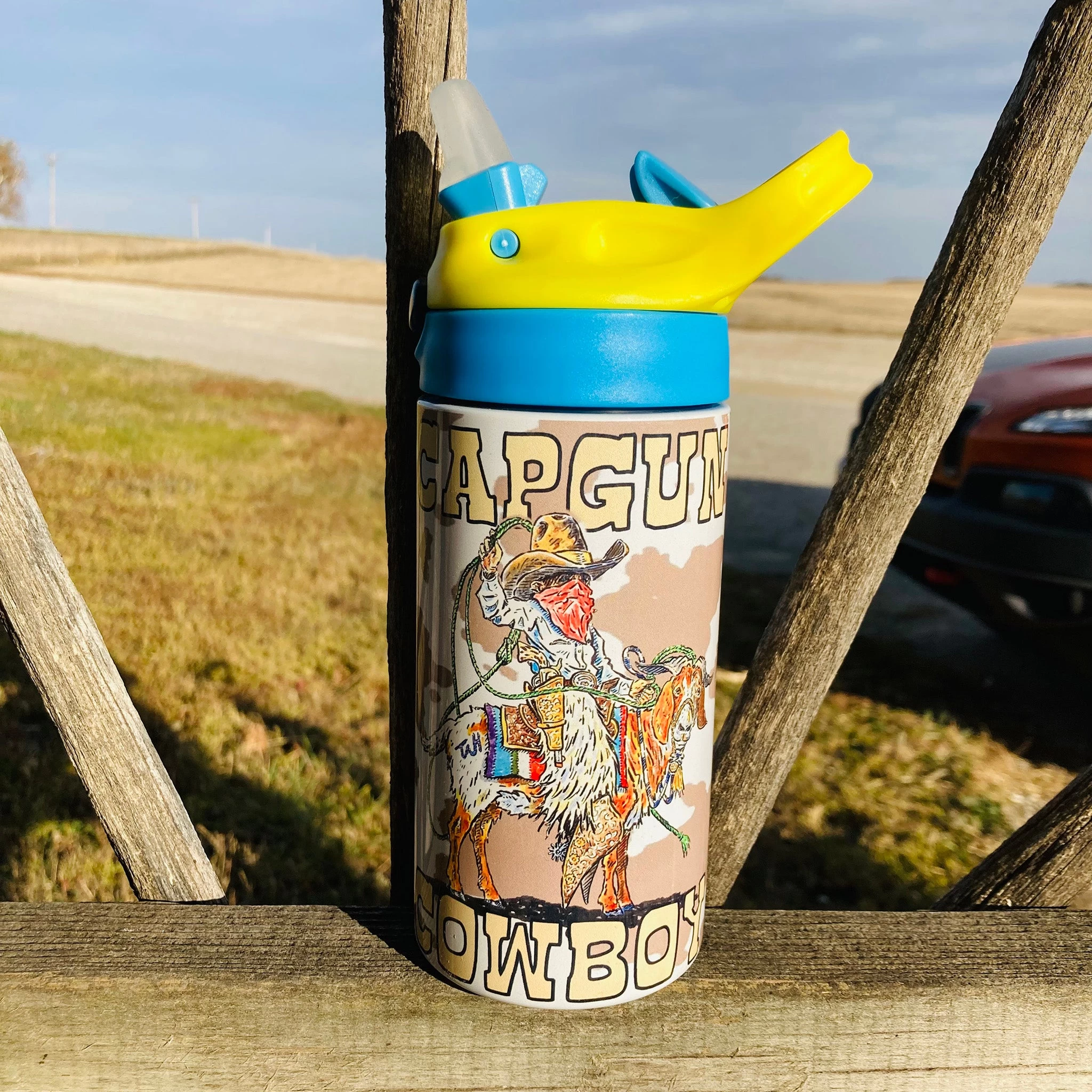 Your wildest little cowpoke will love this new “cap gun cowboy” tumbler! These kid tumblers have the pop top lids with straw, which makes drinking easy and the snap close spout to prevent exposure of unwanted items. They are spill proof, easy to clean, and keep your kiddos drink cold throughout the day.Â