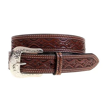 This hand tooled 3 diamond leather belt will take your look to the next level! It has a double stitched edge and a interchangeable buckle.