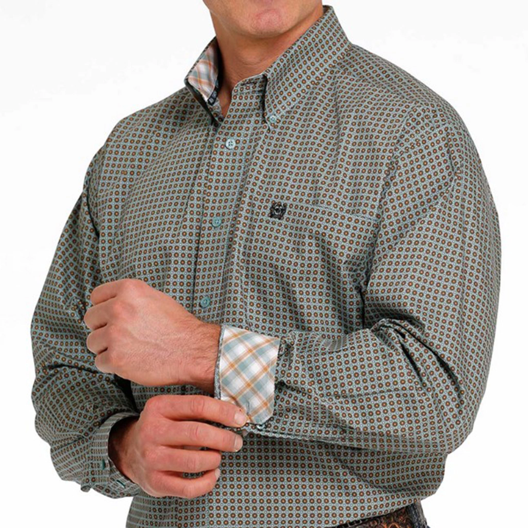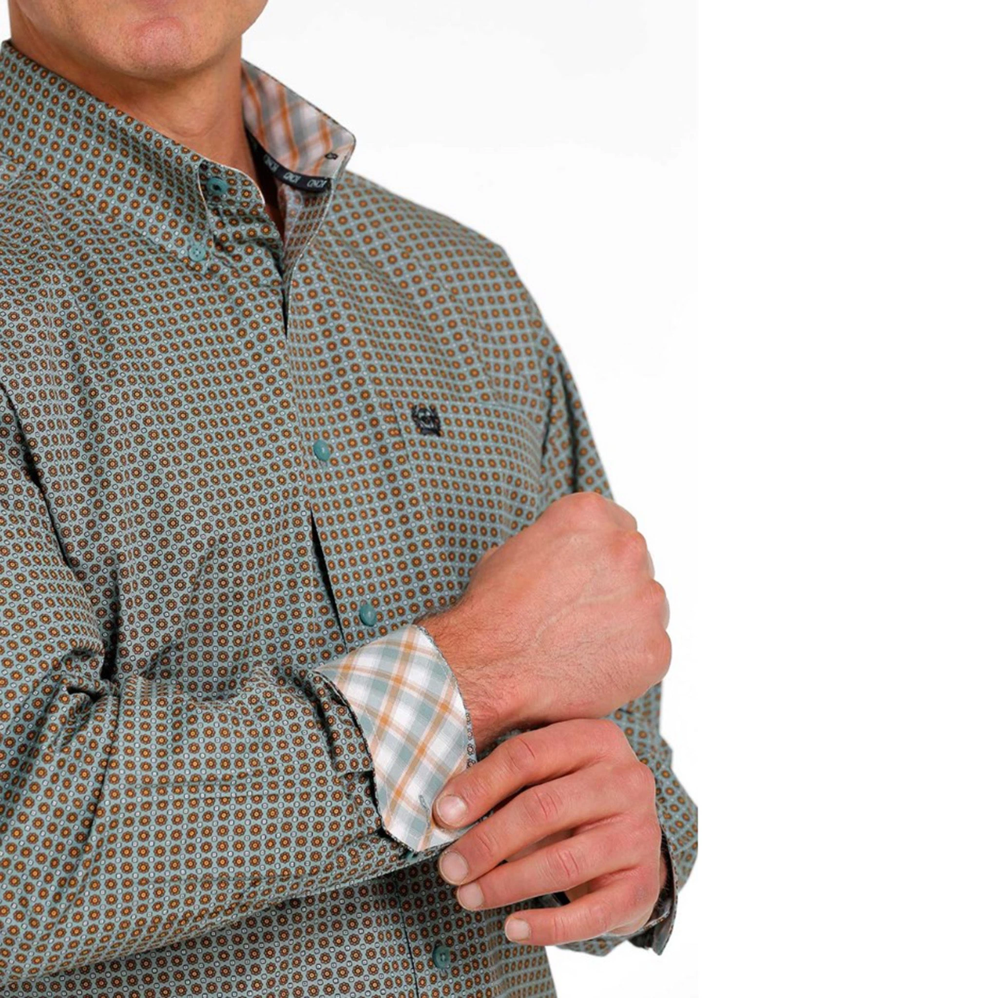 Cinch added contrasting detail to this blue and orange shirt. This button-down shirt features orange circles and plaid printed cuffs and neckline with a single chest pocket.