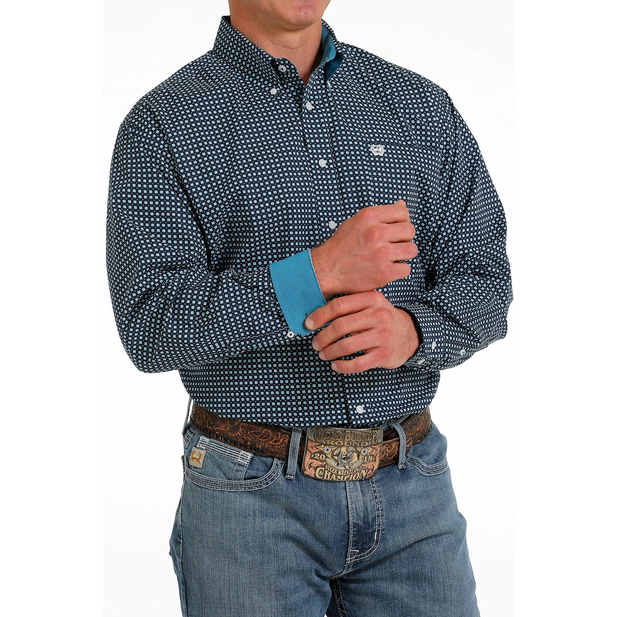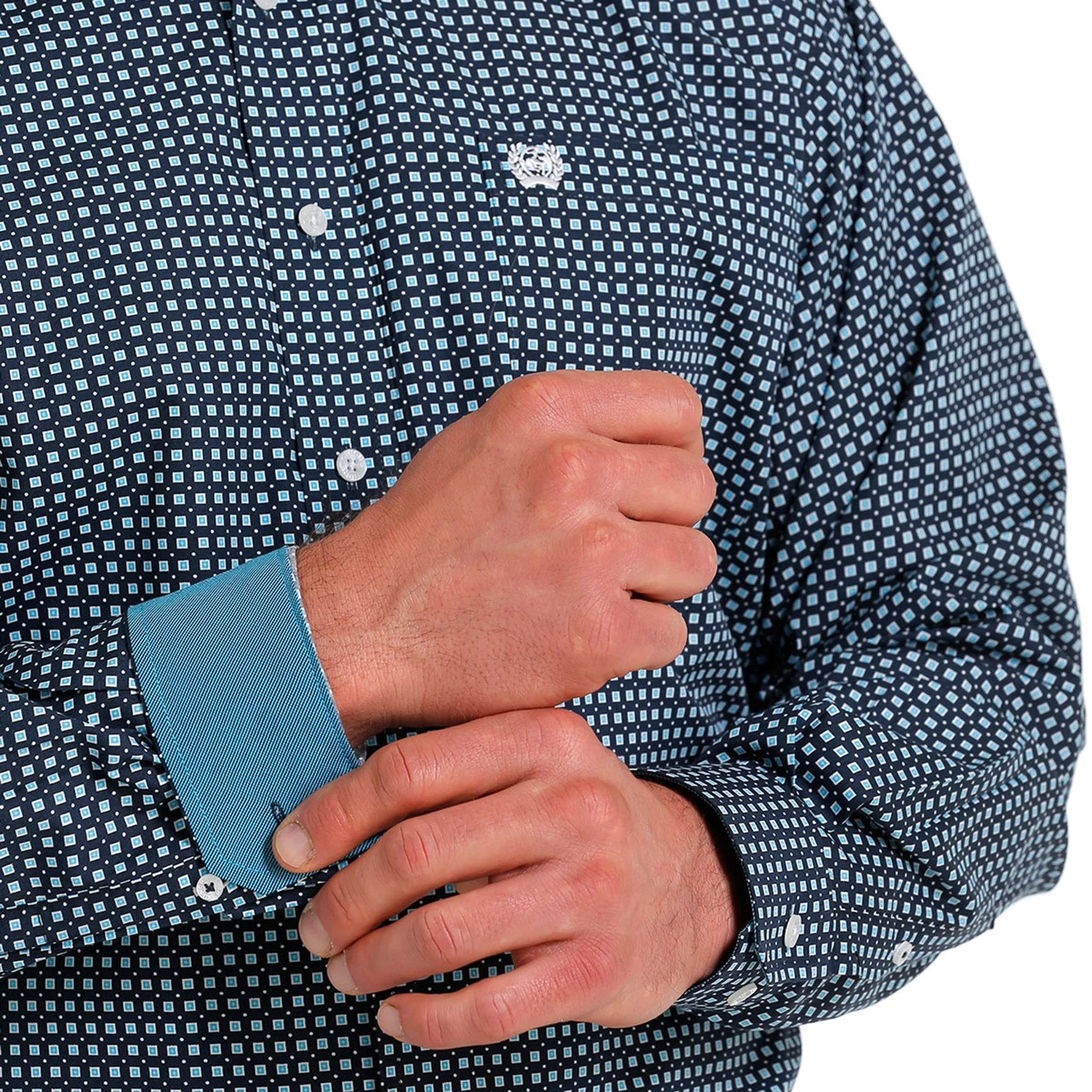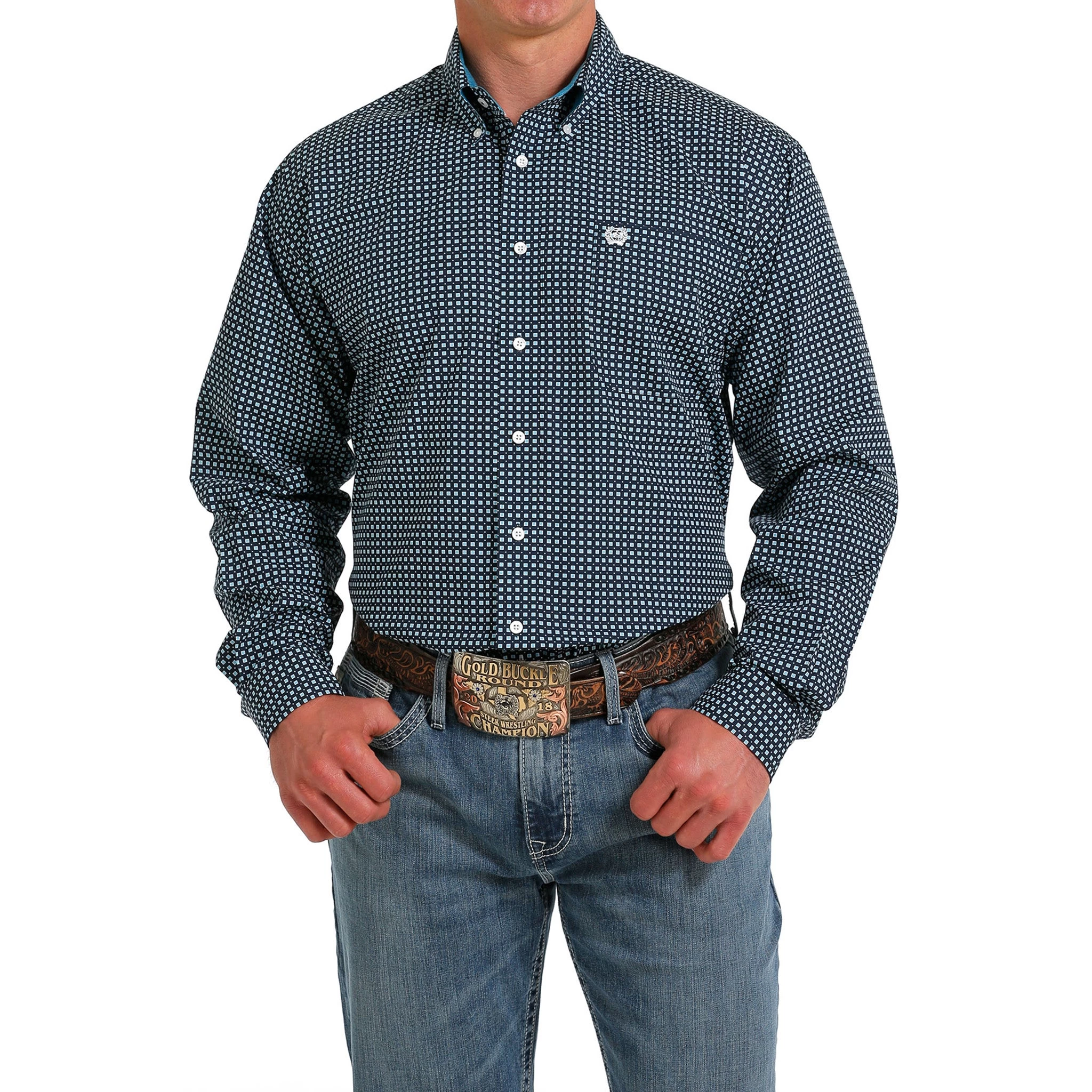 Elevate your favorite blue jeans by pairing them with a handsome cotton plain weave button down engineered by Cinch. This shirt features a navy geometric print, microstrip contrast trim, an open left front pocket with embroidered logo and white buttons.