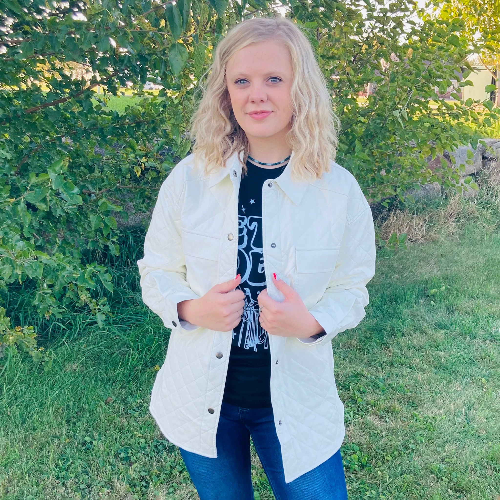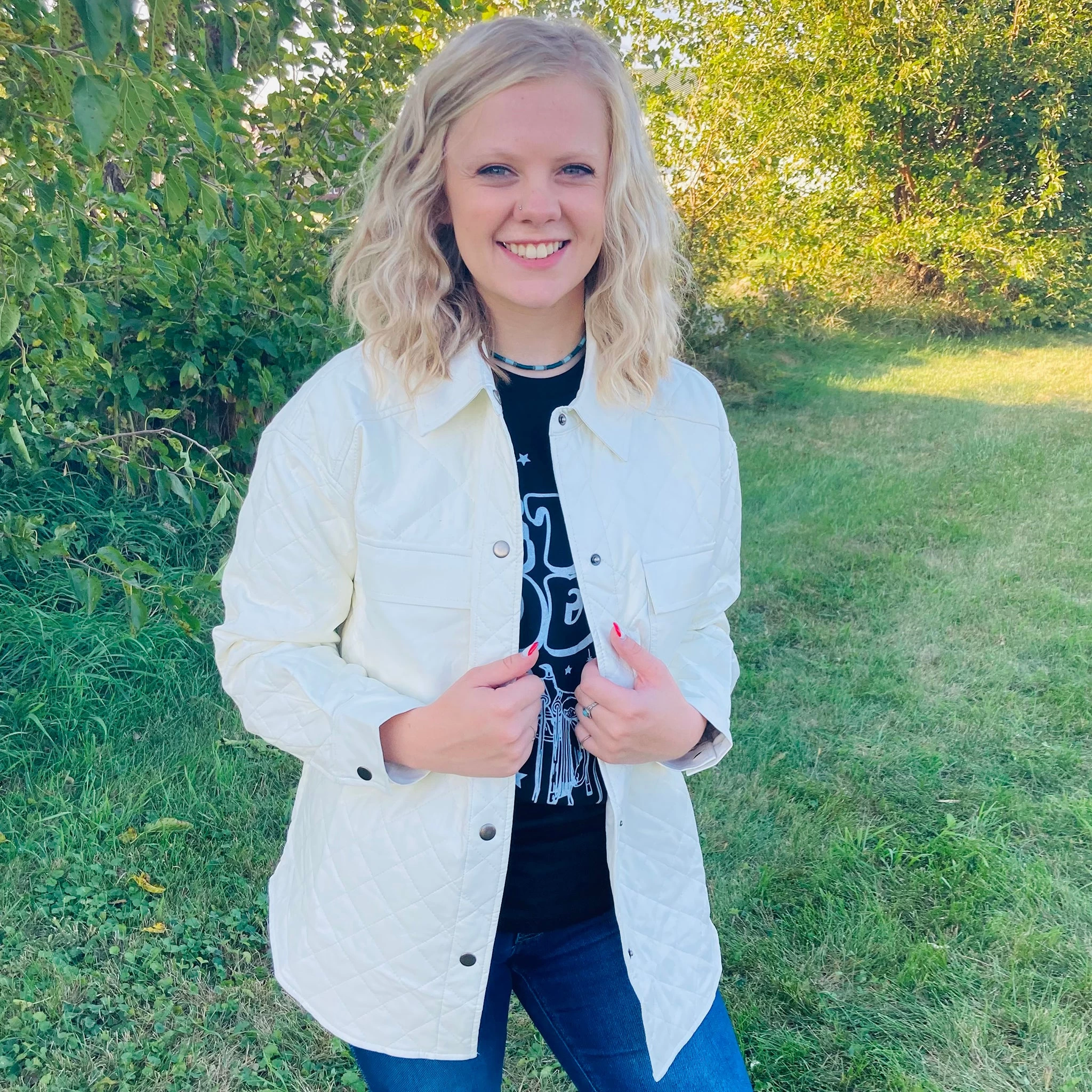 Style and warmth all in one with this cream diamond quilted leather jacket! This jacket features buttons snaps down the front and has two front chest pockets.Â