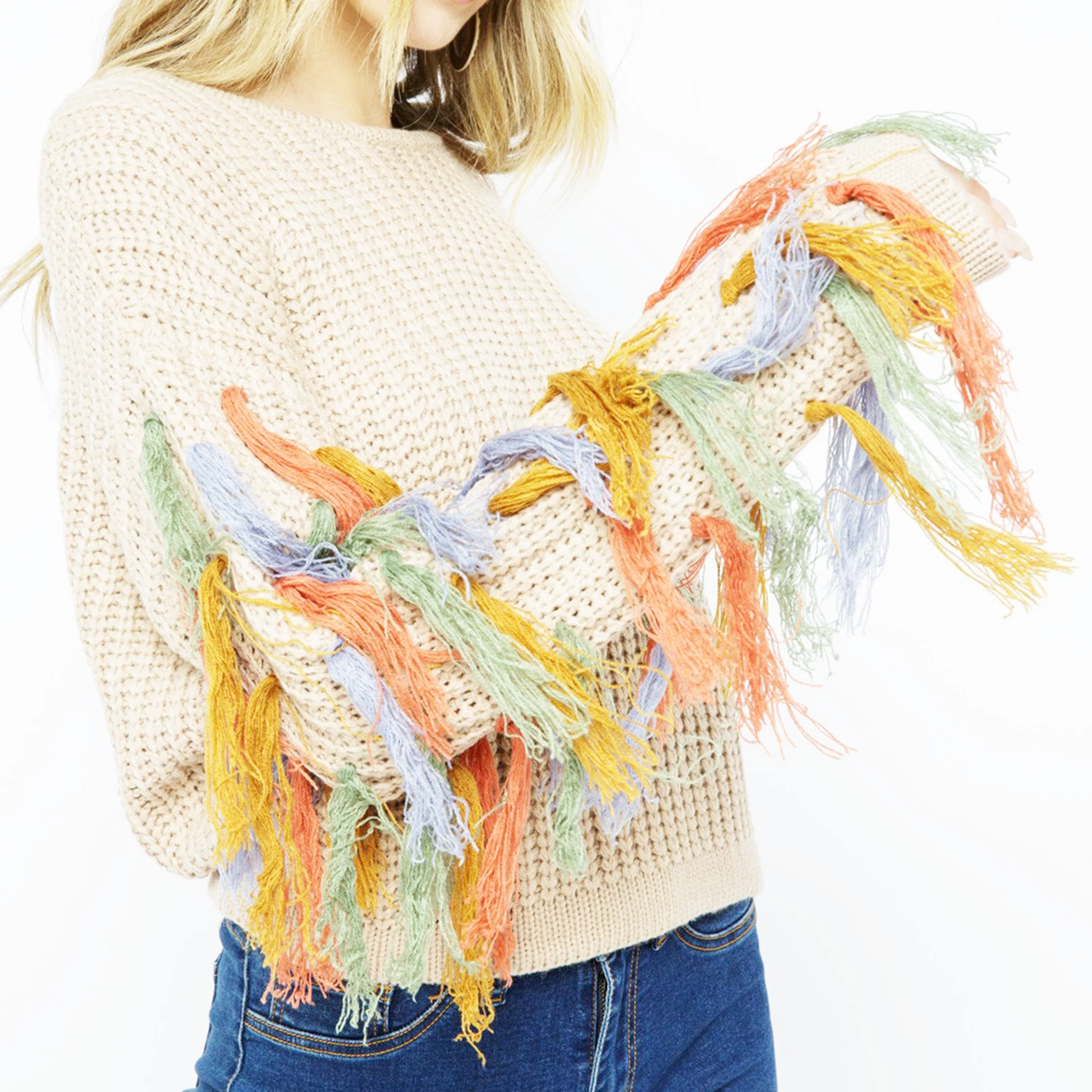 This cropped sweater has multiple colors of fringe detailing the sleeves. It features ribbed cuffs and hemline. Pair with your jeans and go enjoy yourself.