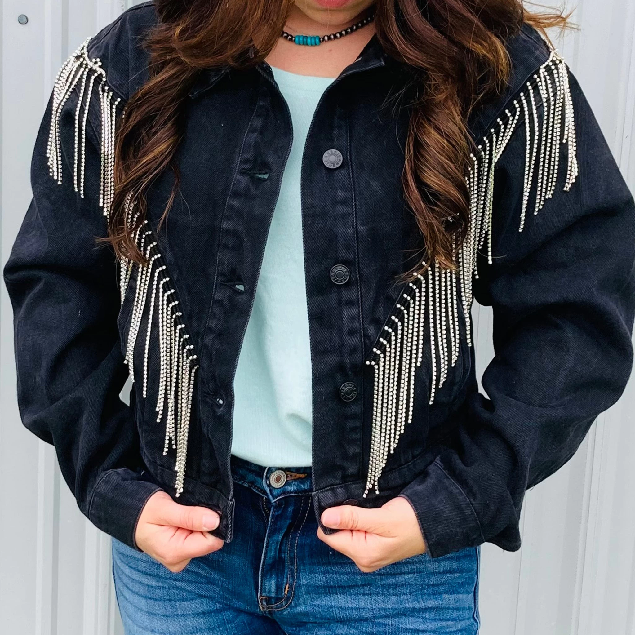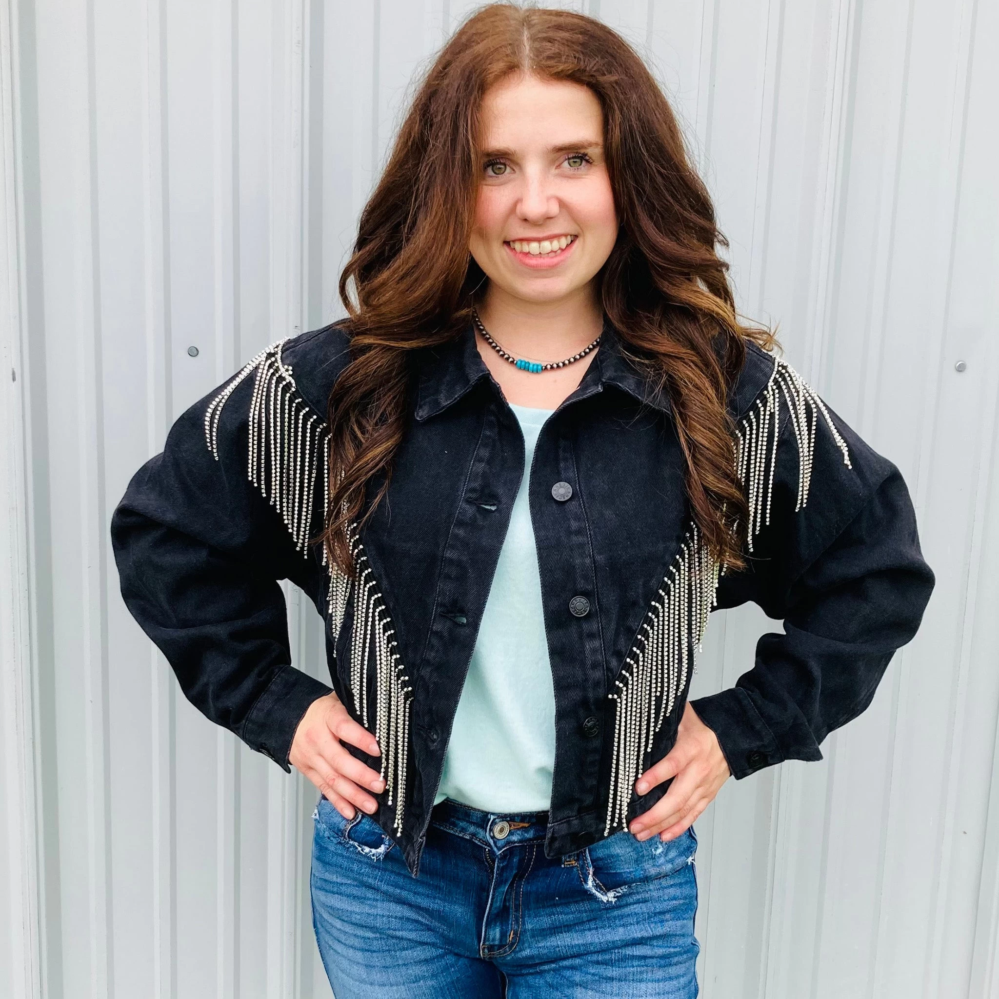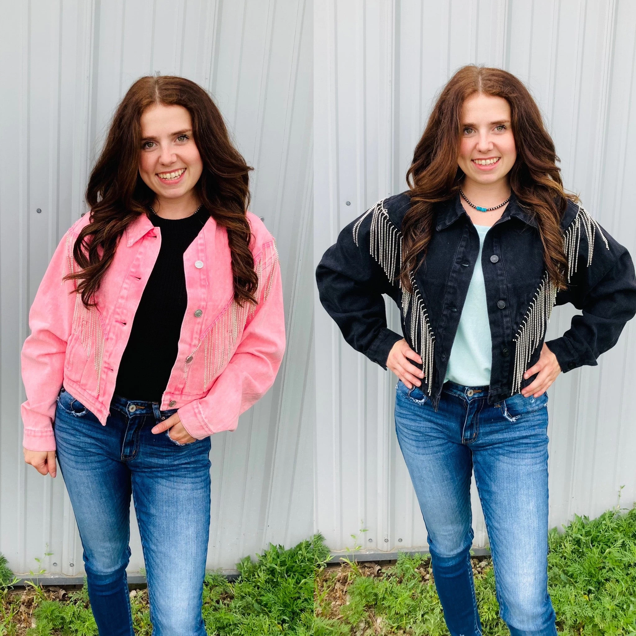 Rather you’re heading to Nashville, Vegas, or just a night out with the girls, these denim rhinestone fringe jackets are a must have! They feature rhinestone fringe on both the front and back of the jacket and are available in black, pink and denim.Â