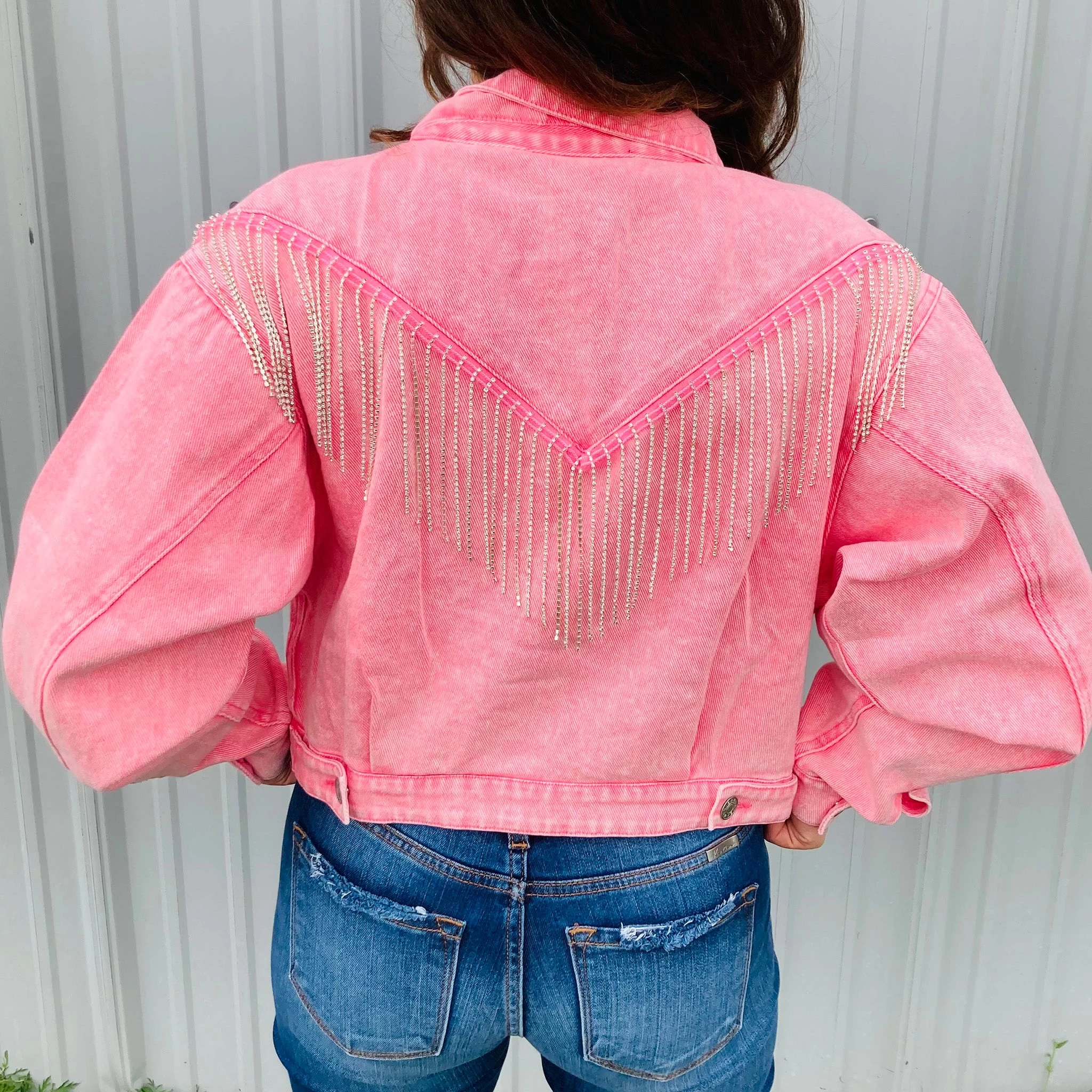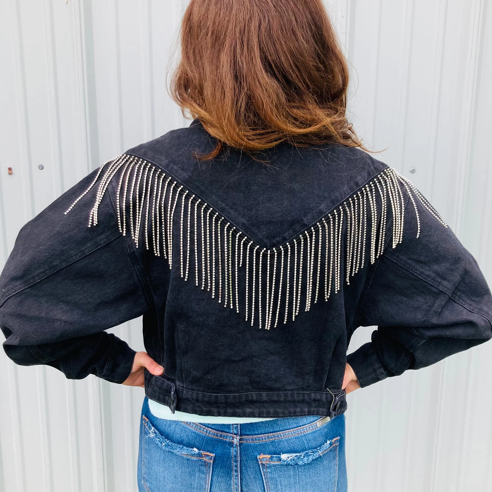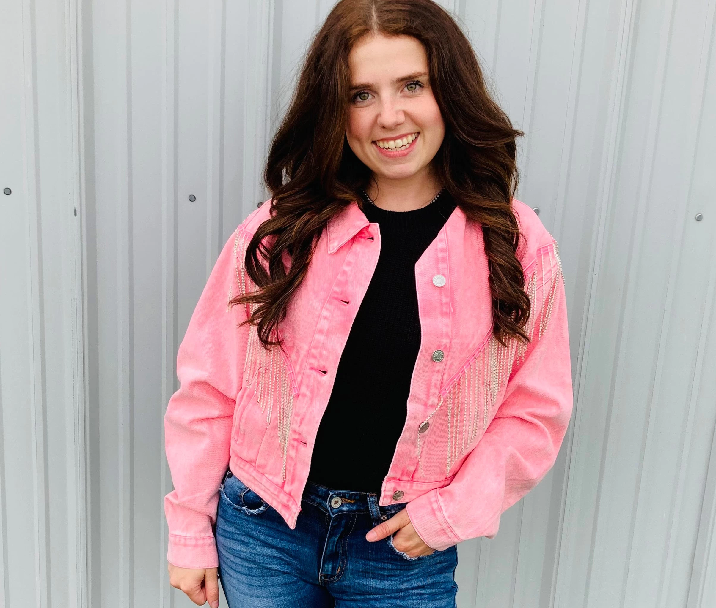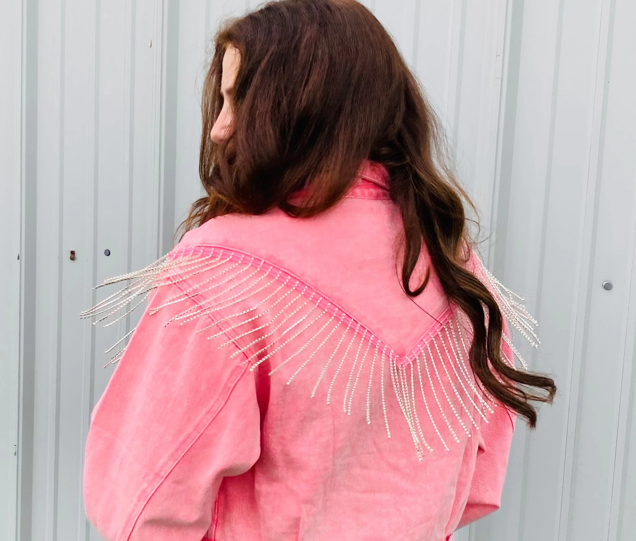 Rather you’re heading to Nashville, Vegas, or just a night out with the girls, these denim rhinestone fringe jackets are a must have! They feature rhinestone fringe on both the front and back of the jacket and are available in black, pink and denim.Â