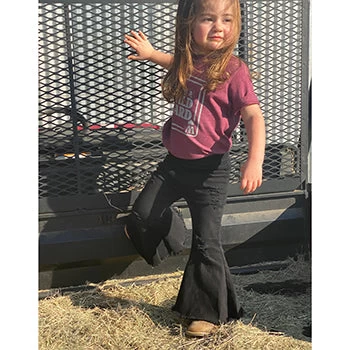 Let your little cowgirls wild side run free with these adorable black distressed bell bottoms. Elastic waist, makes these jeans an easy and comfy fit!