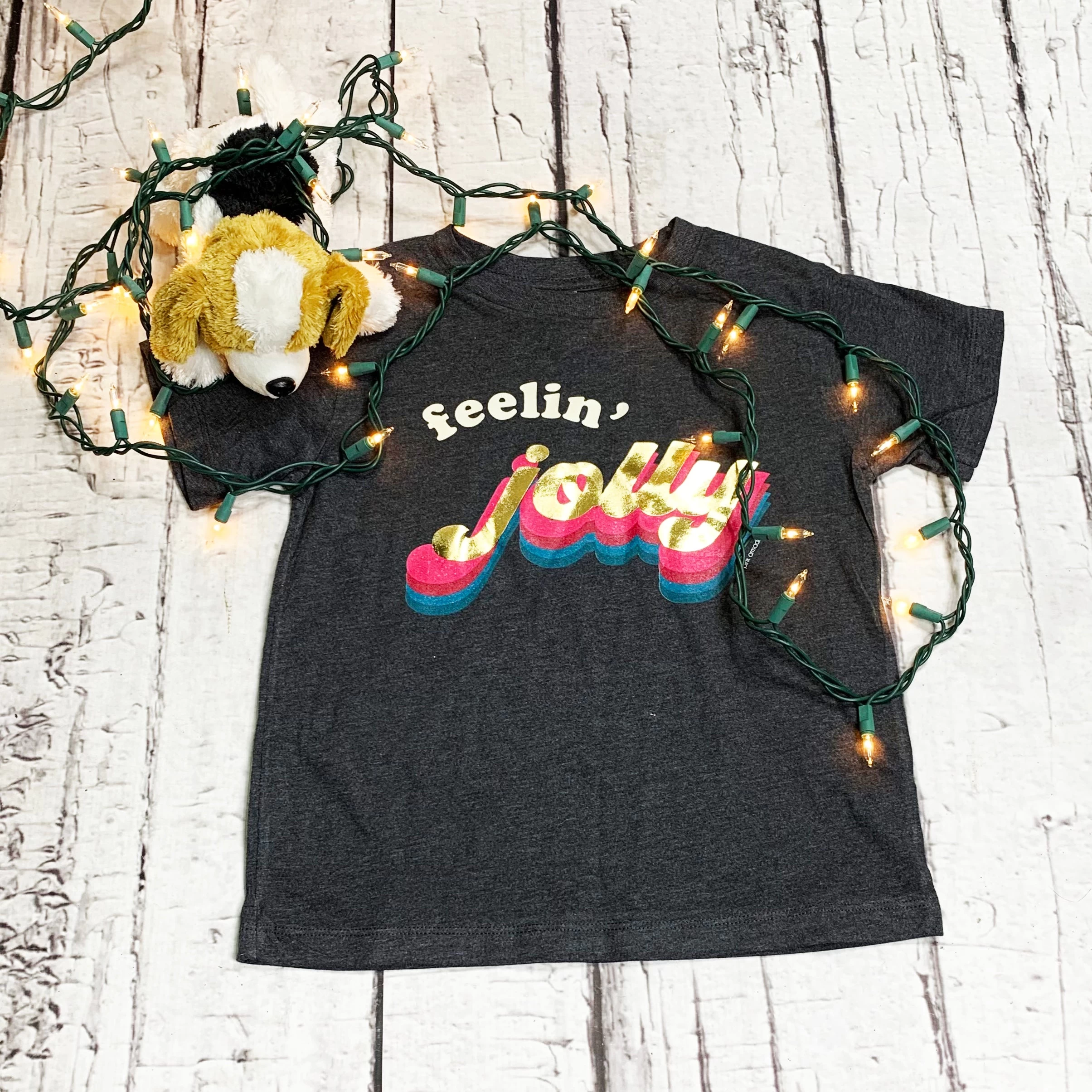 Have your little one feelin’ jolly in this cute 70’s style wording t-shirt. Cute and comfortable shirt that they can wear year around.