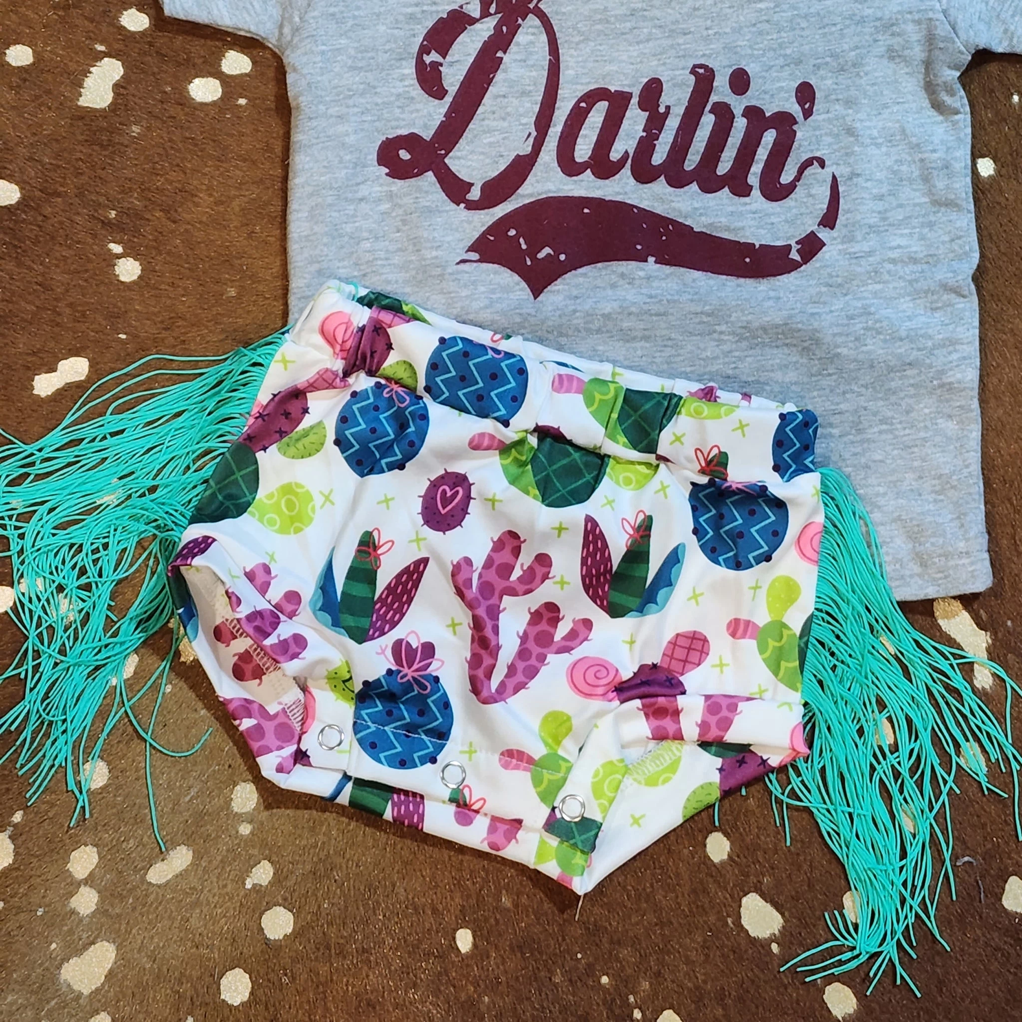 Show off your little angle in these colorful cactus fringe bummies! Cute, soft & streatchy. 3 buttons for easy diaper access.Â