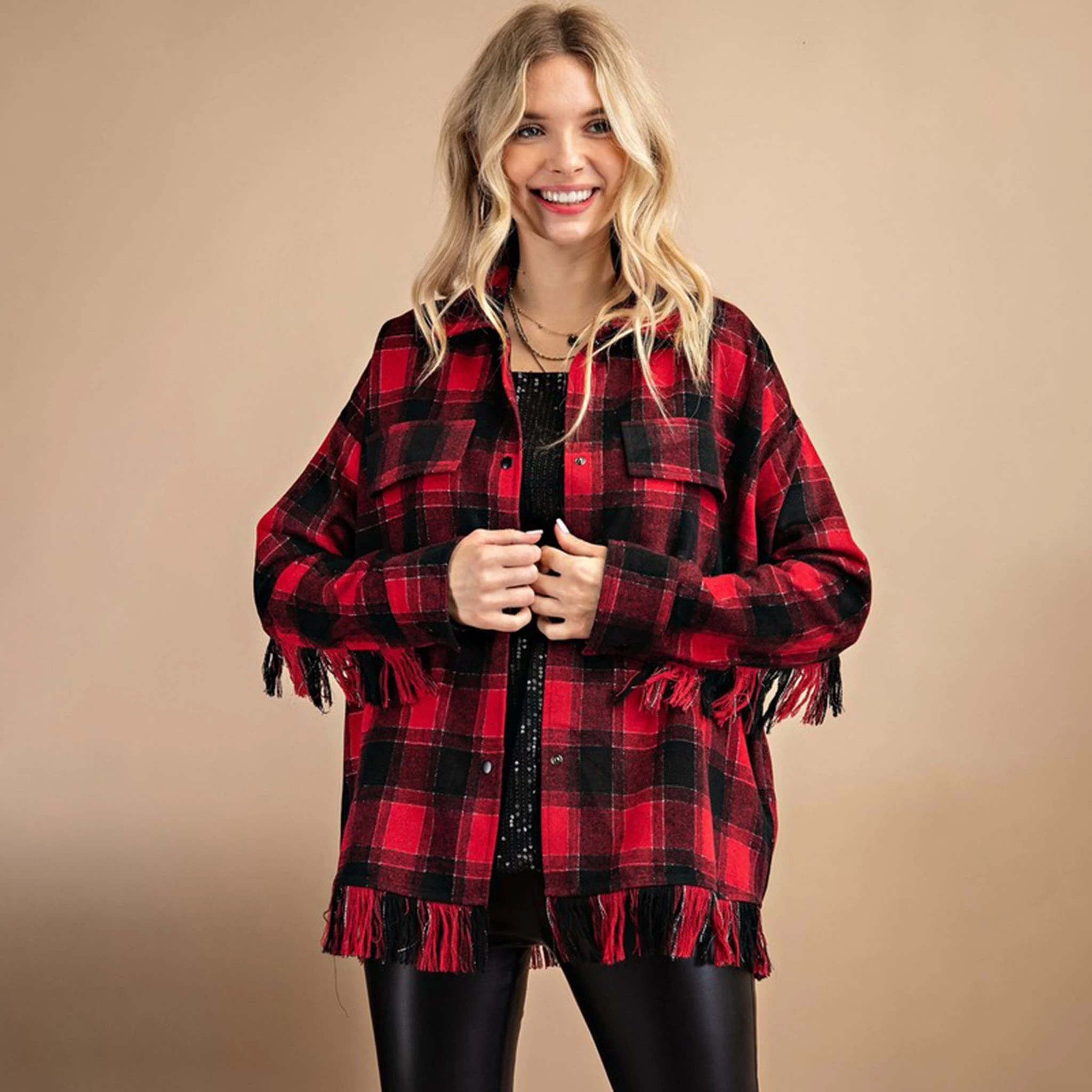 This stunning fringe detail buffalo plaid Shacket is an absolute must have as the temps begin to cool down! It is a great weight, sure to keep you warm without wearing you down!
