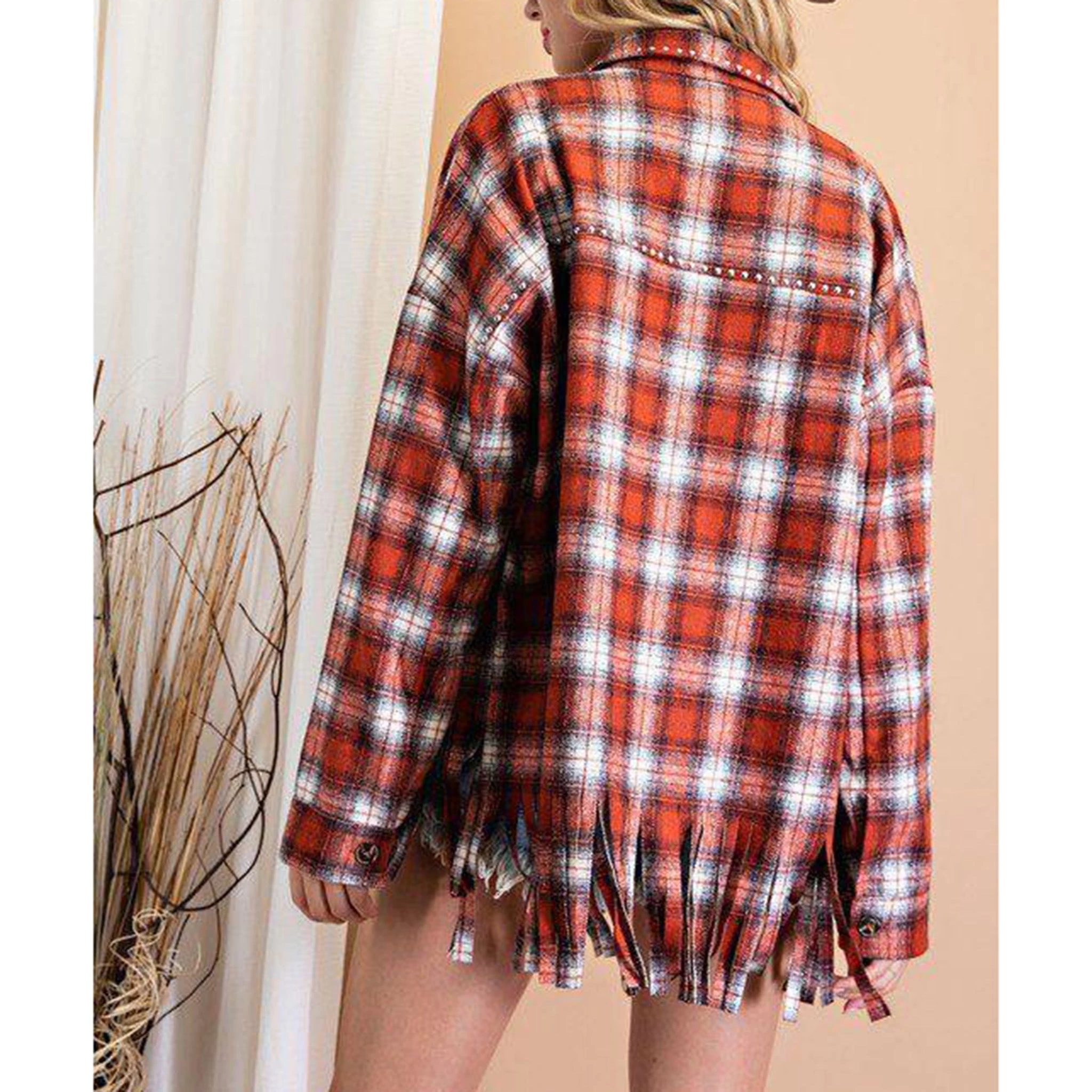 This western styled shacket is perfect for adding more detail to your outfit. It features a fringed hem, two studded chest pockets with button closure down the front and on the cuffs.