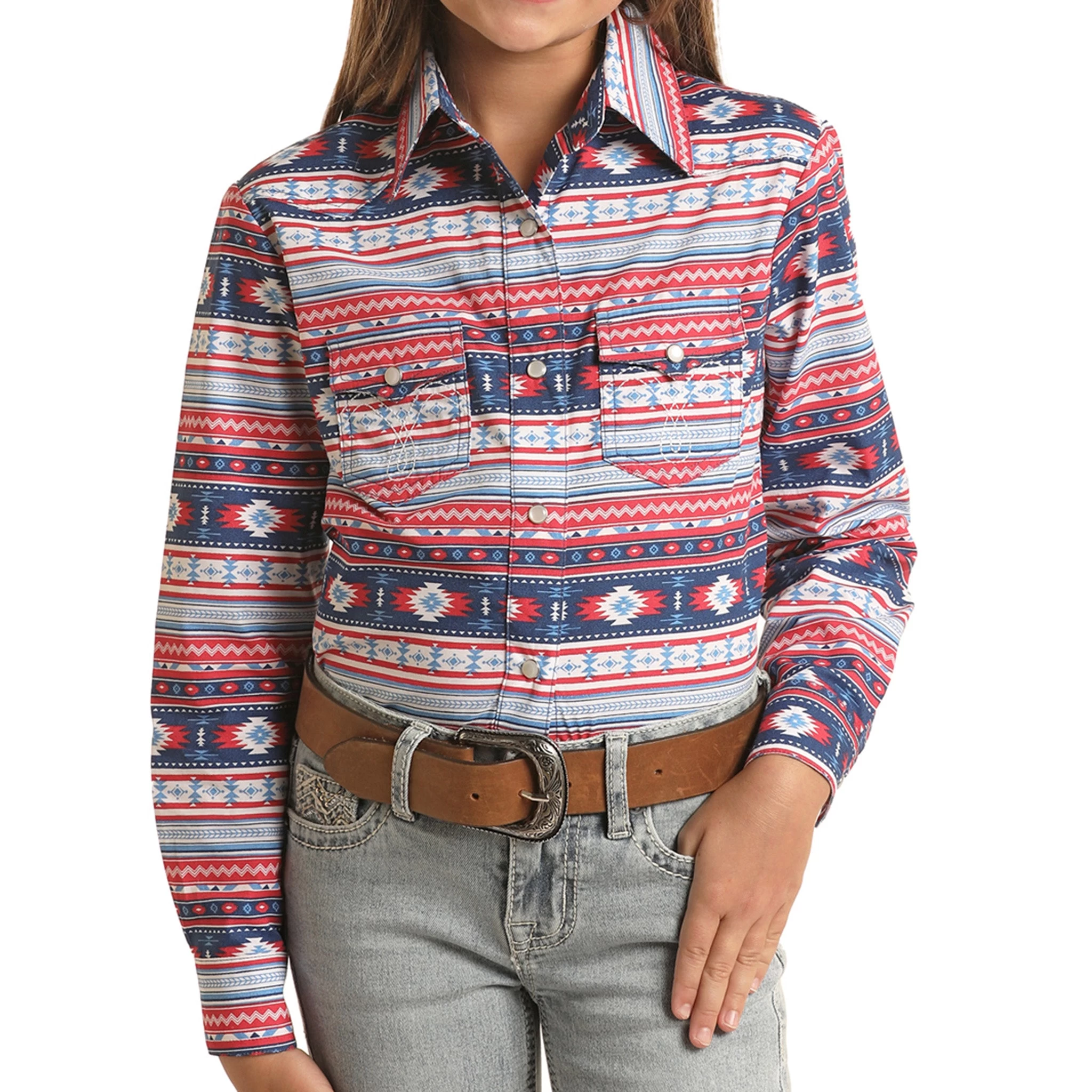 Celebrate any occasion with this fun Red White & Blue Aztec Print Shirt! A horizontal aztec print throughout really gives a new dimension to the traditional colors.