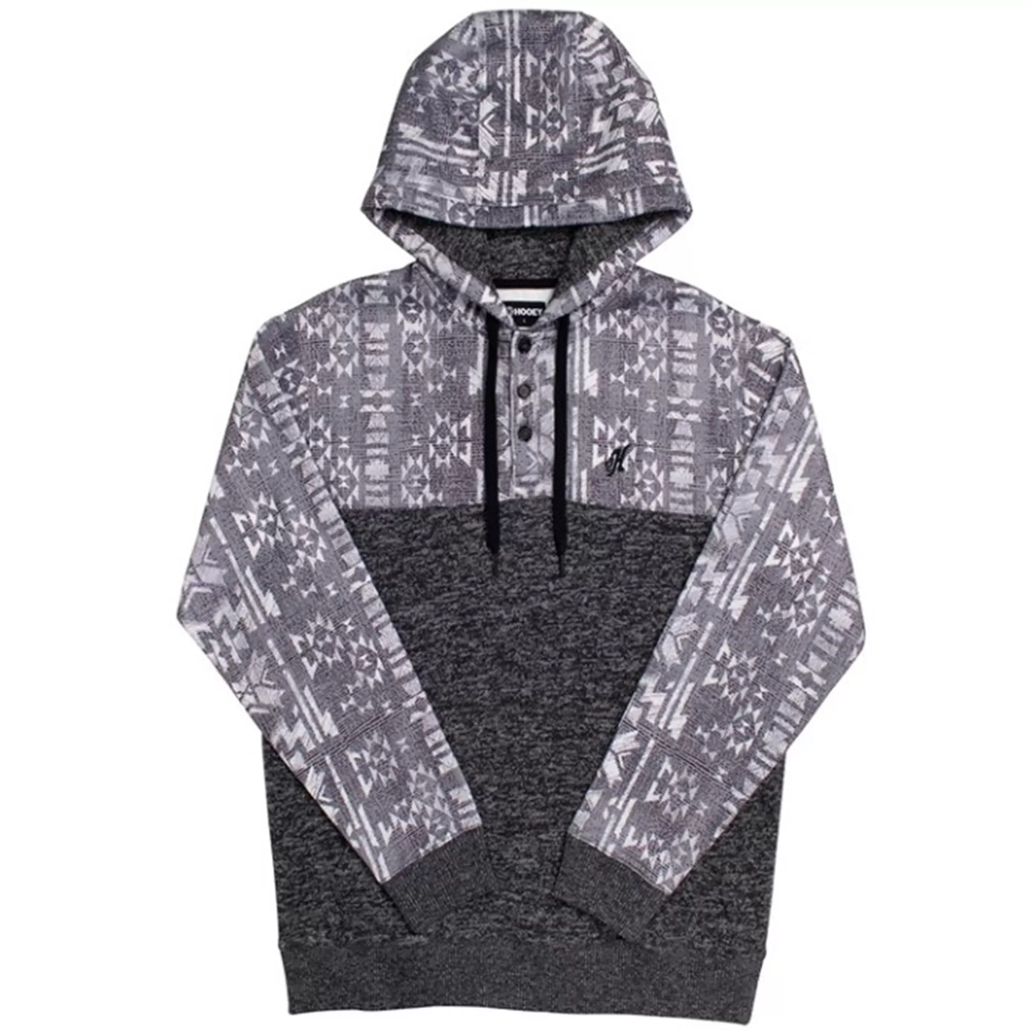 This hoody is perfect to pair with your favorite jeans or slacks. The grey Aztec print has 3 buttons and an embroidered Hooey H on the left chest. It features a kangaroo pocket and hidden phone pocket.