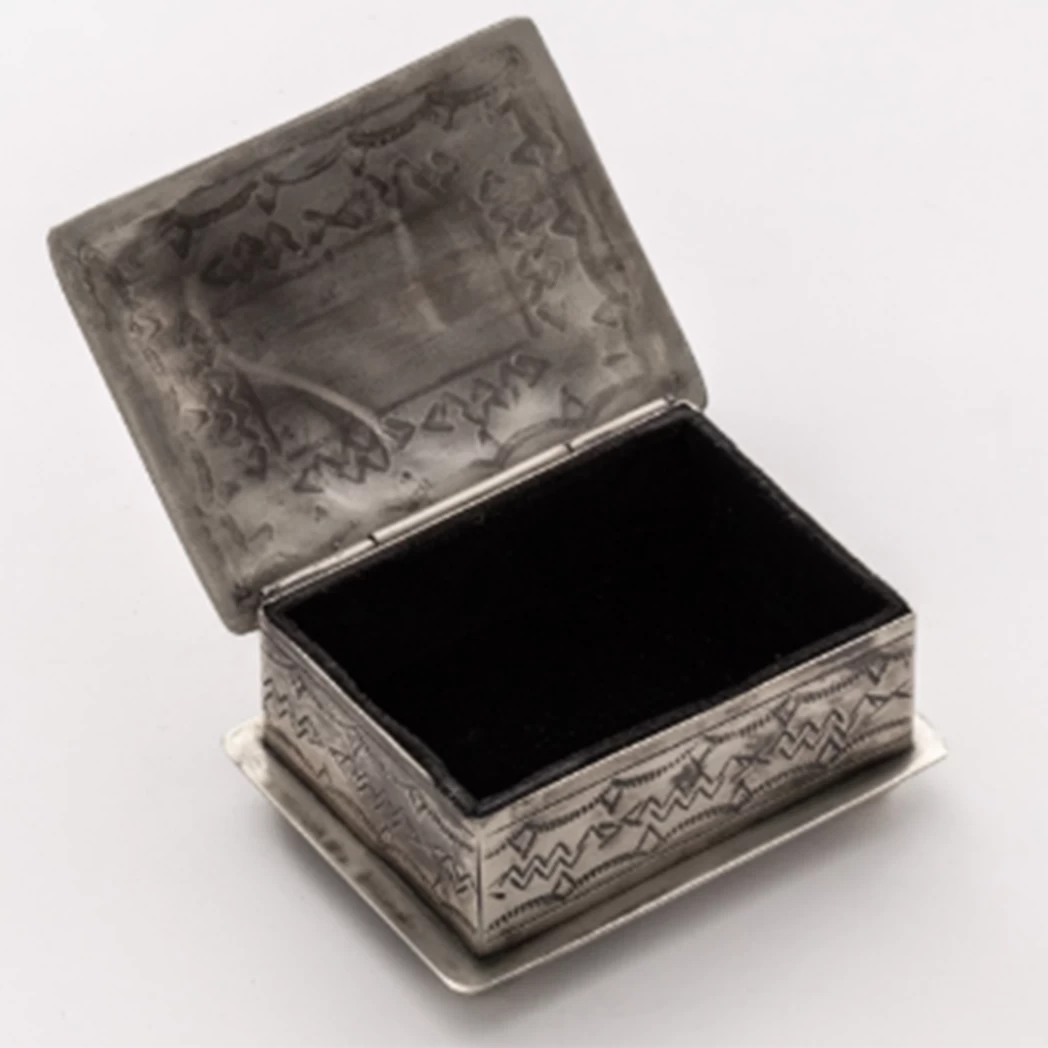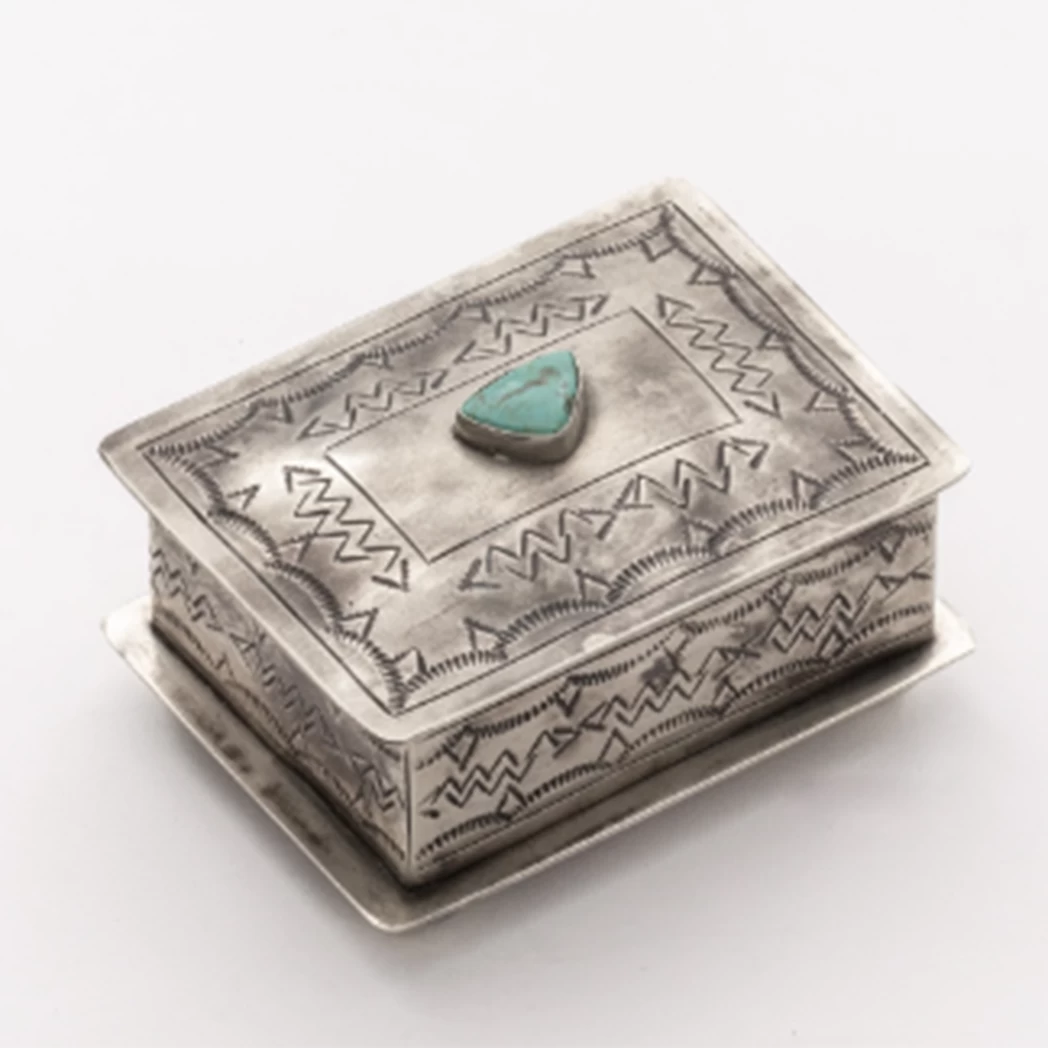 This beautiful silver engraved small box is a great keep sake box or small jewelry box. The genuine turquoise stone is a great added touch to this cute box.Â