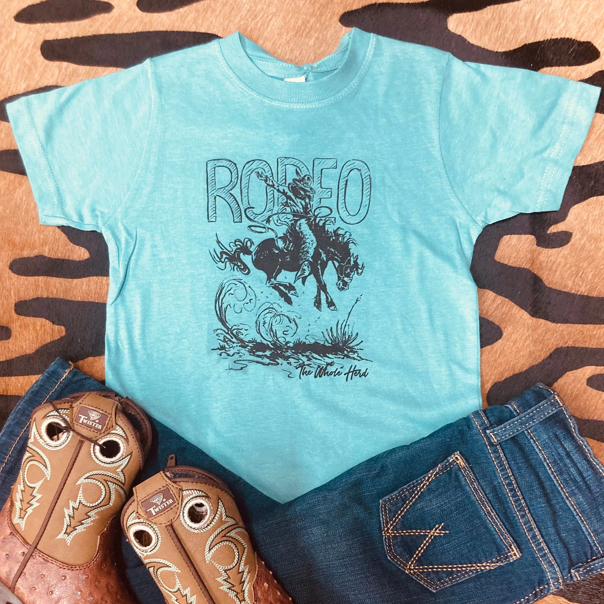 Your little cowboy needs this turquoise rodeo Dallas tee, that features a bucking horse on the front with the words “Rodeo” above it. This tee comes in infant, toddler, and youth sizes.Â