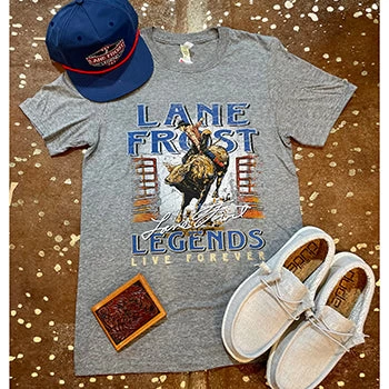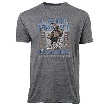 This Grey Lane Frost “Challenge” T- Shirt pays tribute to one of the best showdown’s on dirt! The “Challenge of the Champions” was an epic 7-match battle between the two 1987 Champions: Lane Frost & Red Rock. In 309 attempts, no one had successfully ridden Red Rock.