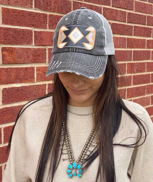 A lightly distressed charcoal cap featuring a black/white/silver hand painted leather patch.Â