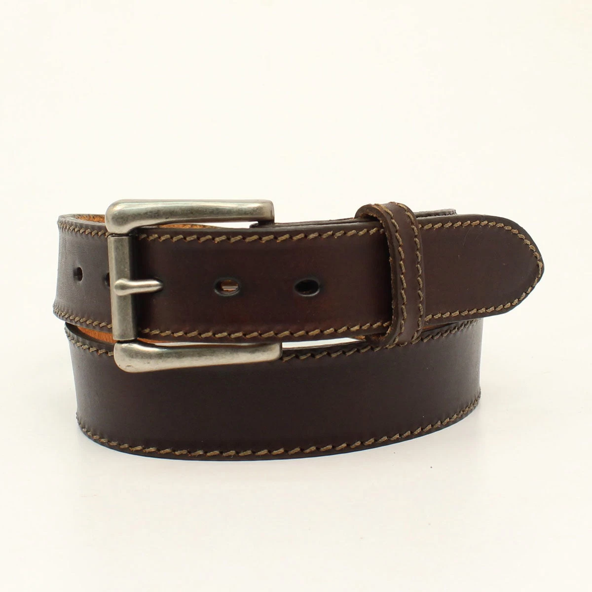 This men’s belt features a chocolate color throughout! There is tan stitching weaved through the edges of the belt. This belt was made in the USA with top grain leather!