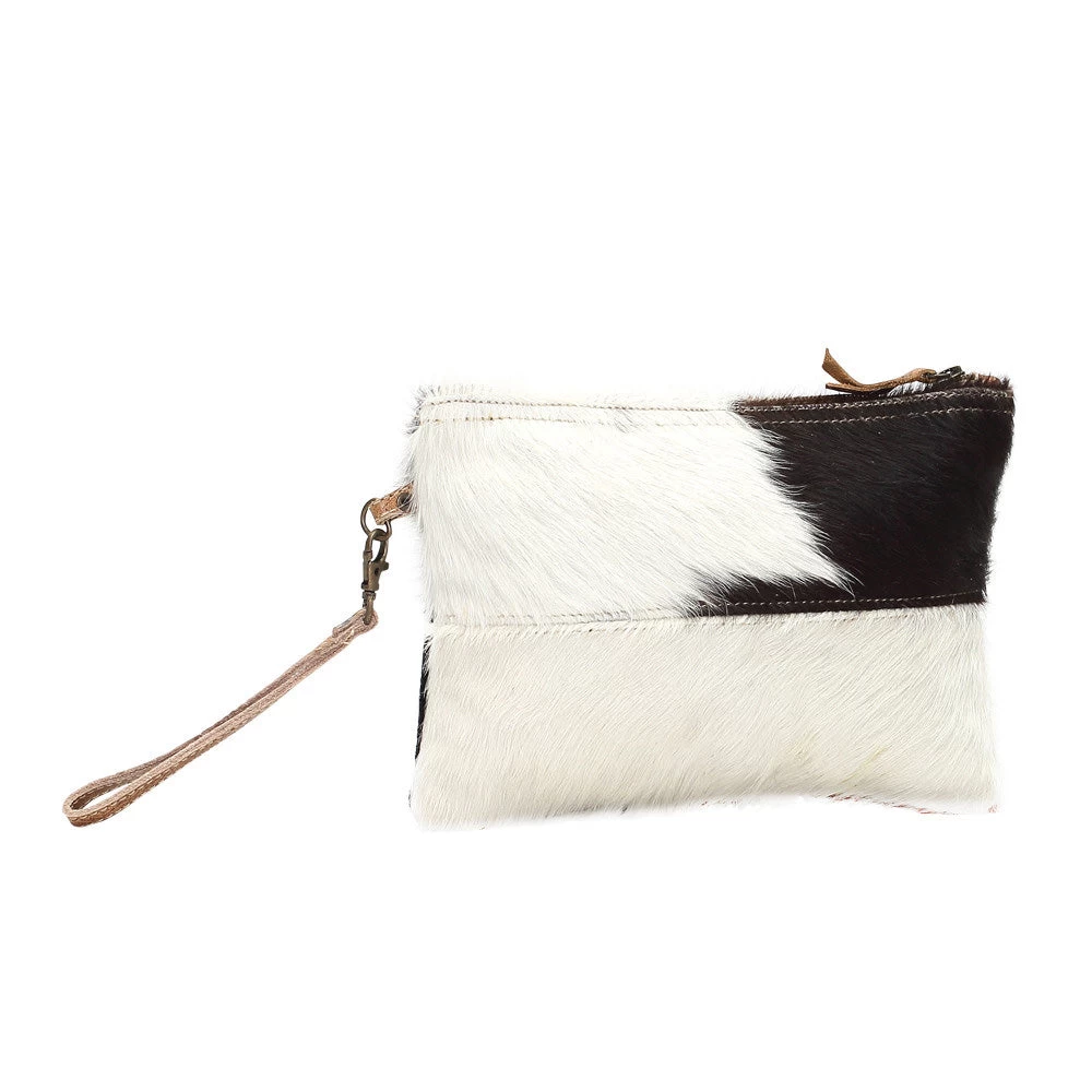 This small clutch is perfect for concerts and events! The clutch has multiple beautiful hide patches with accent buttons! It zips on top and has a removable wrist strap.