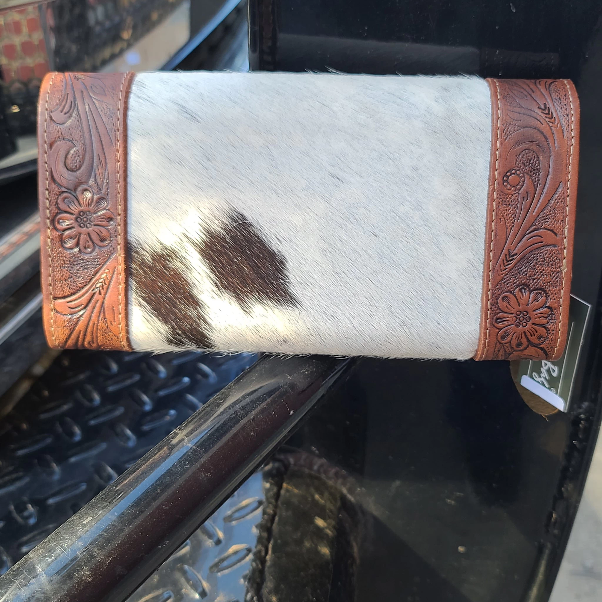 We just love this hand tooled leather wallet. This wallet comes with multiple card slots and a designer front flap. Wallet also has a turn lock.