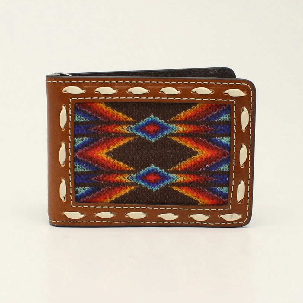 Keep your credit cards and cash organized in one place with this bifold money clip. This great wallet has a multi colored Aztec design fabric inlay with tan and ivory buck lace edges. Inside features multiple compartments for your credit cards, cash, and an ID window.