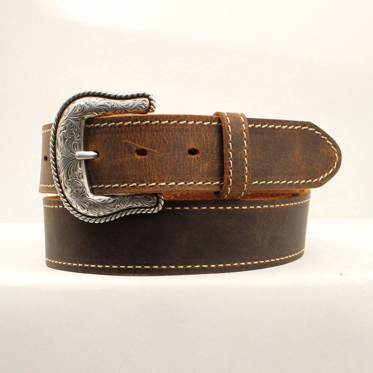 This men’s brown belt from Nocona features ivory stitching on the edges and an antique silver buckle with a single leather keeper!Â
