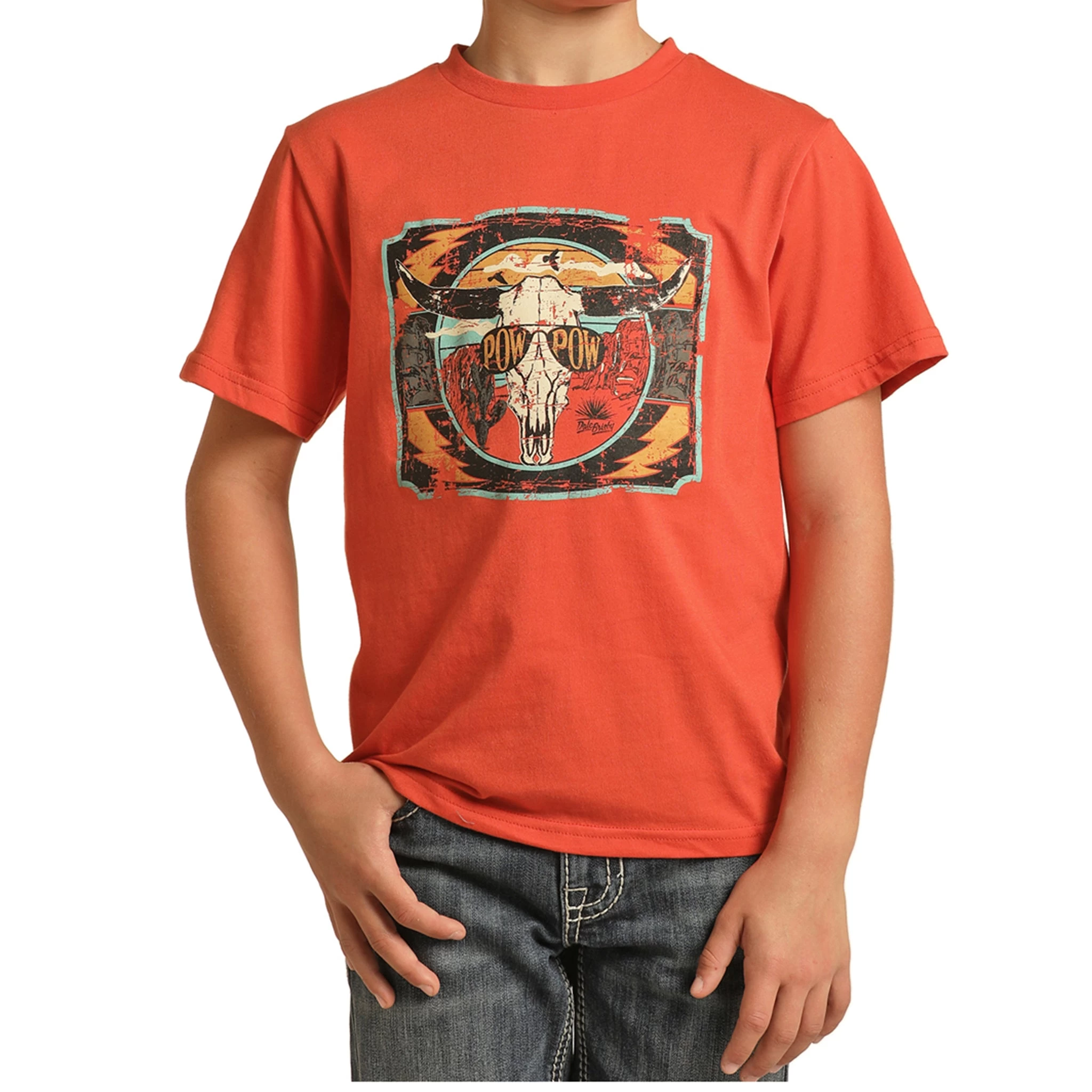 Panhandle Slim brings you this kids Pow Wow T-shirt with a bull skull and sunglasses. This shirt will be a great addition to any kids spring/summer wardrobe.