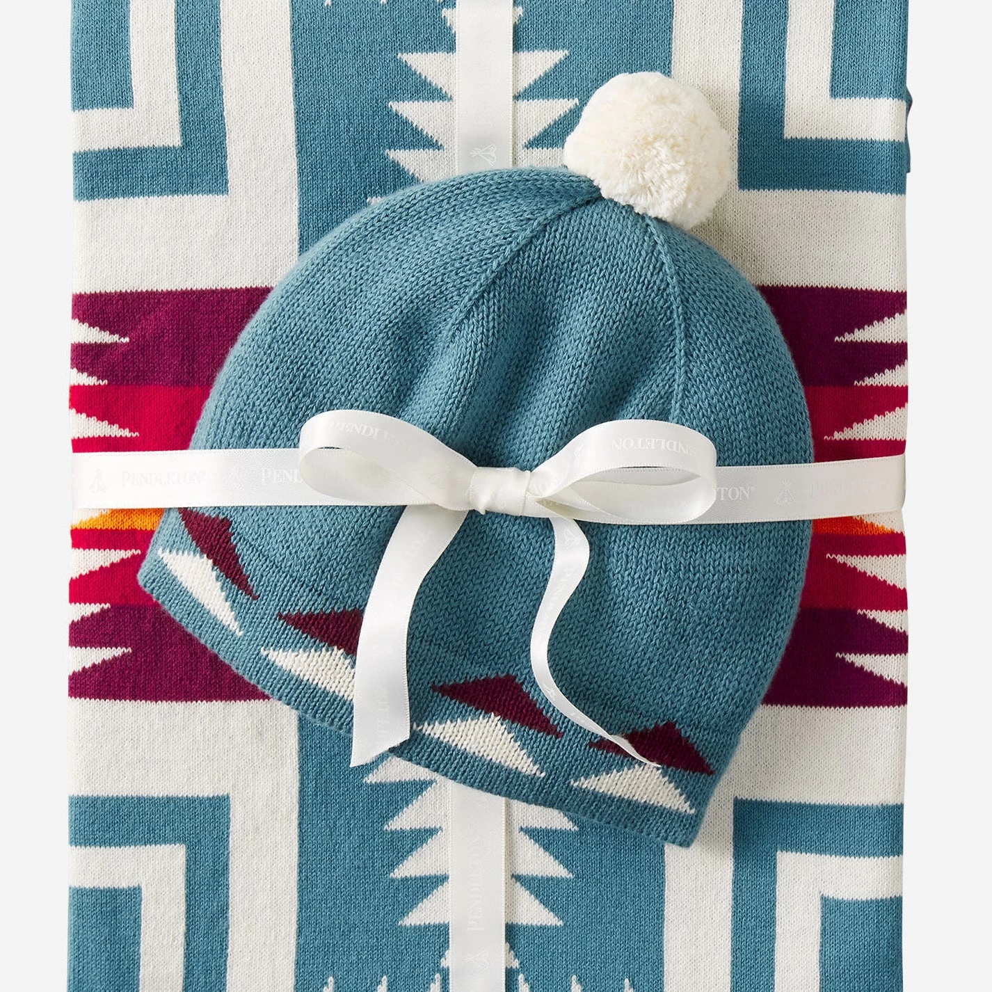 Cuddle with your new little one with this soft, machine washable, cotton knit western blue patterned blanket. The blanket comes with a matching beanie to keep your little one’s head warm.Â