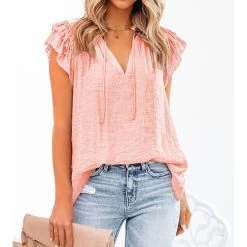 This pink tiered ruffle blouse is so classic. The V neck on this top really gives it that added touch.