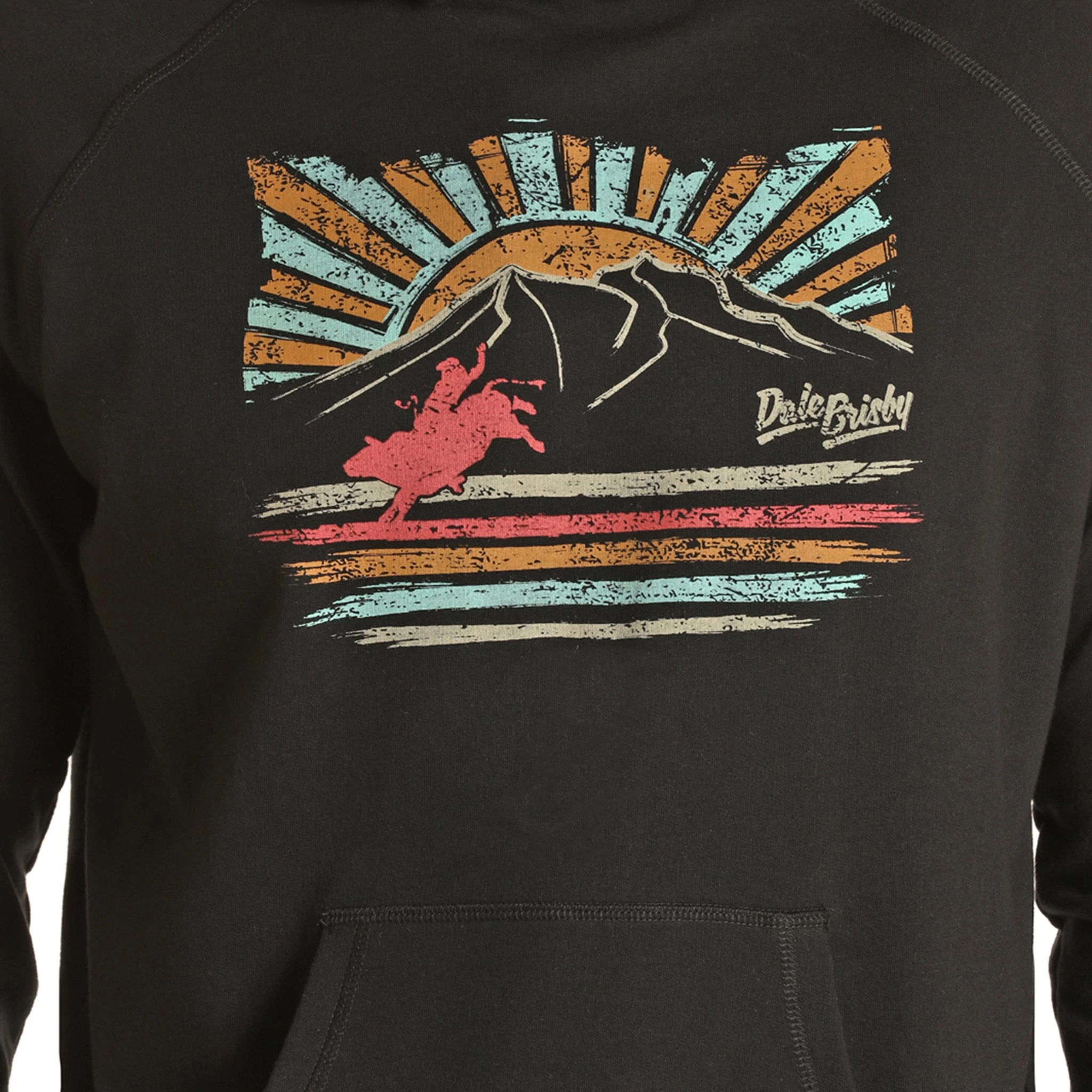 - Front Graphic Features A Sunrise Over Mountains And A Bucking Bull