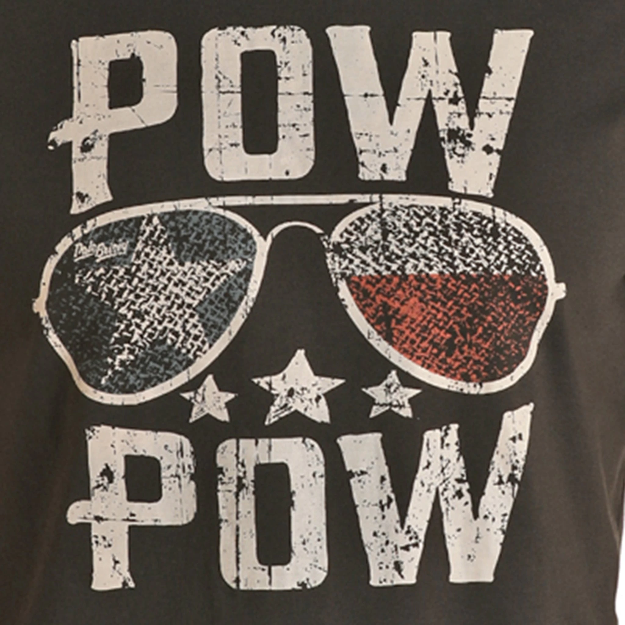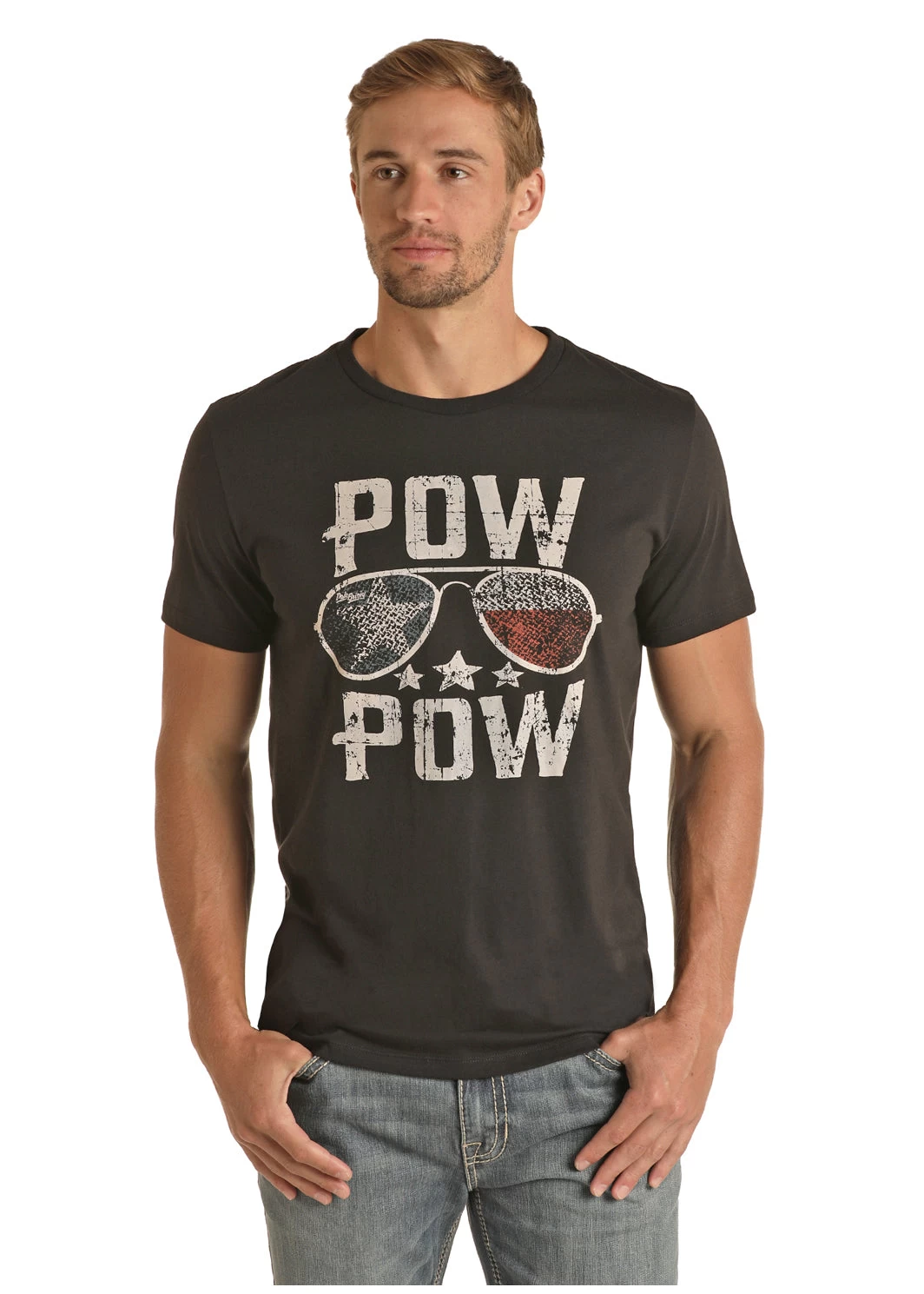 Rock & Roll basic black tee with vintage P.O.W. chest graphic by Dale Brisby!. The 60%-40% blend keeps graphic always looking great!Â
