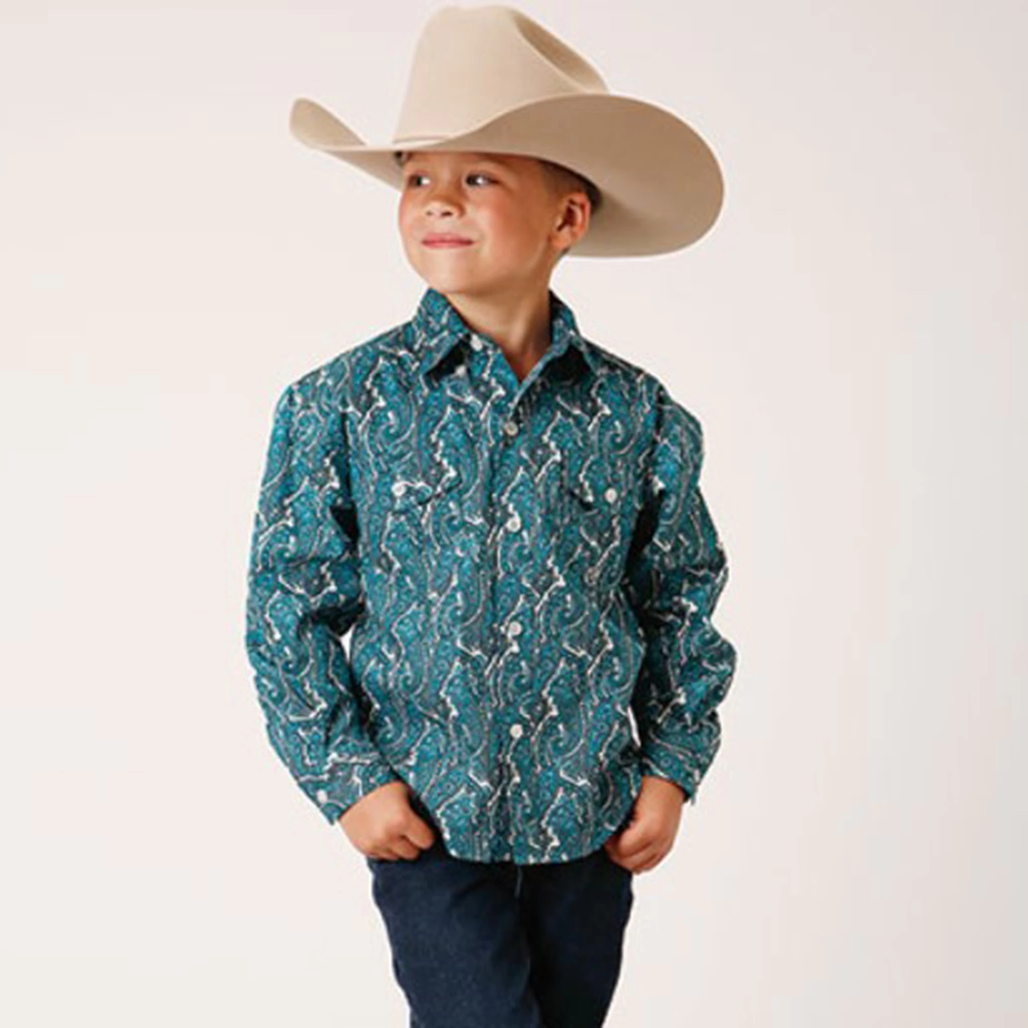 This good looking turquoise paisley print Roper long sleeve shirt will have your cowboy looking sharp.Â