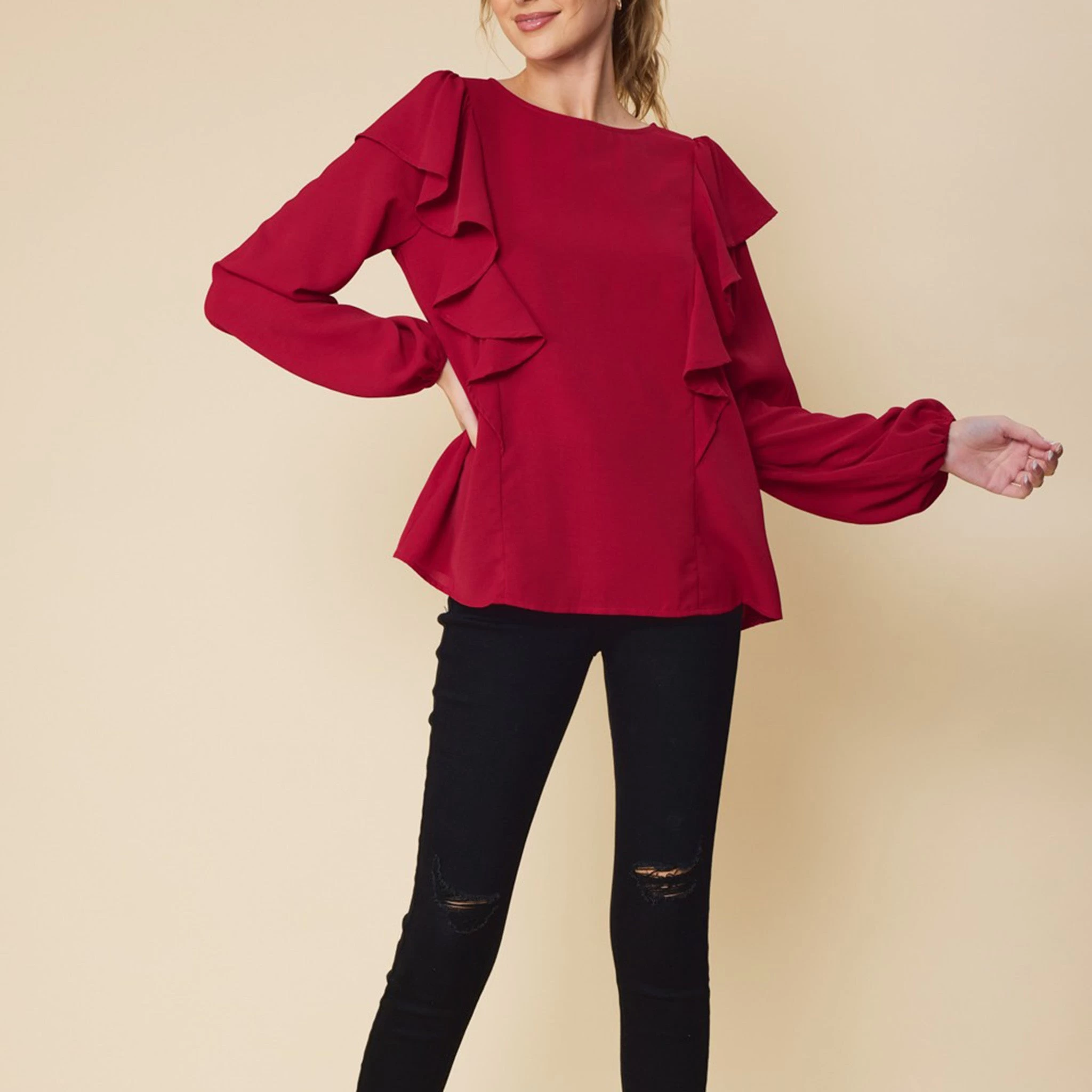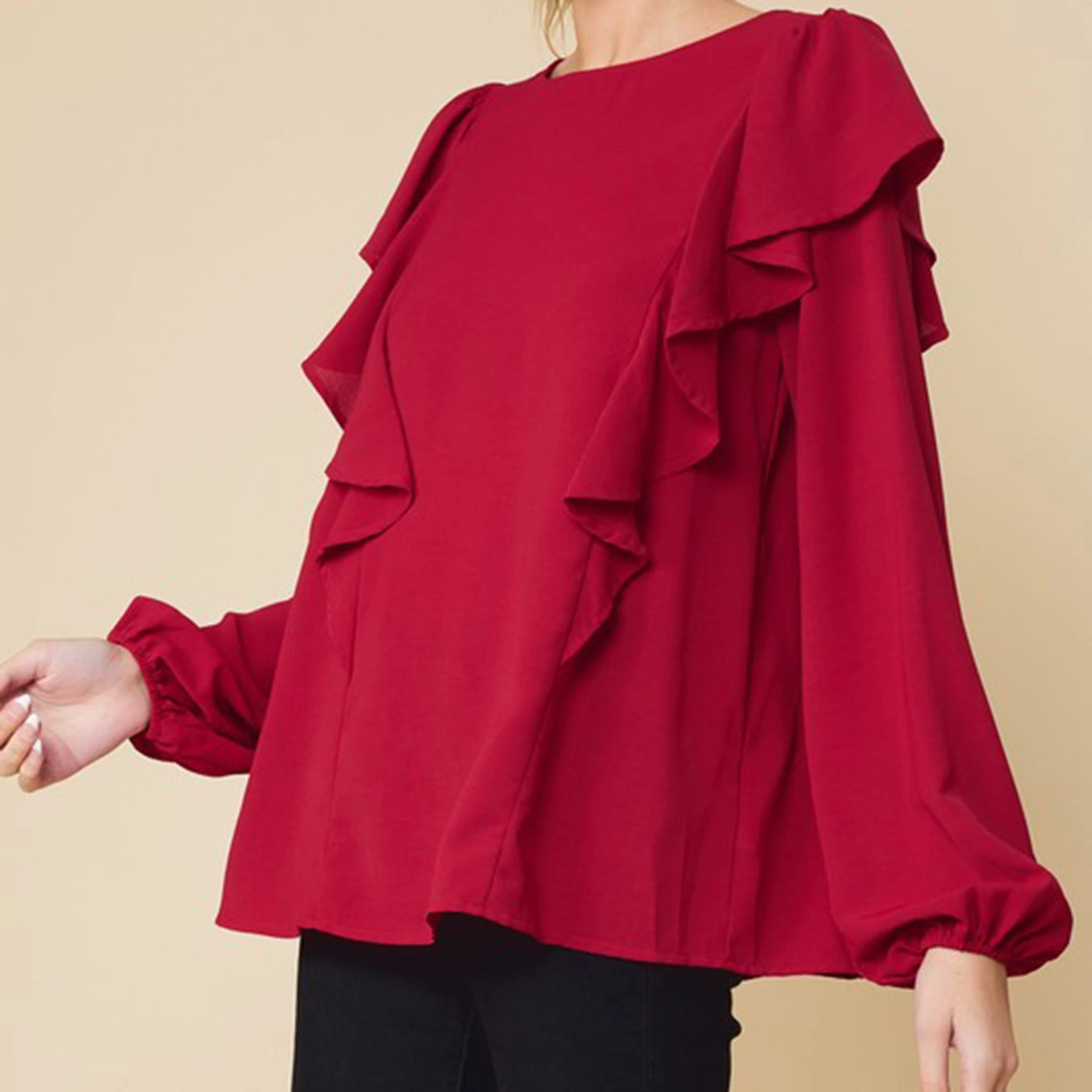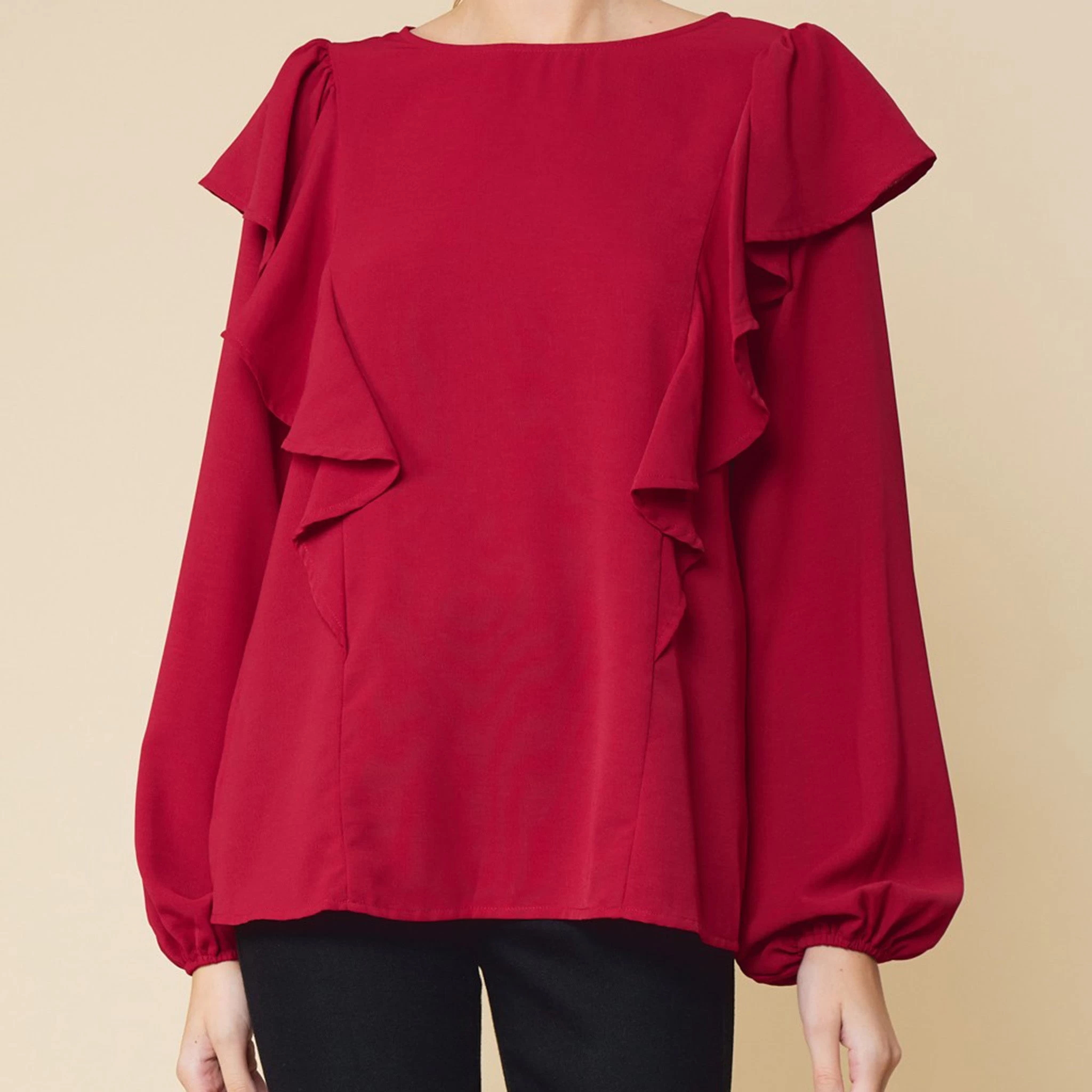 This stunning ruffle detailed top, is perfect for the season! The color is gorgeous and the ruffle sleeve gives it a beautiful feminine style.