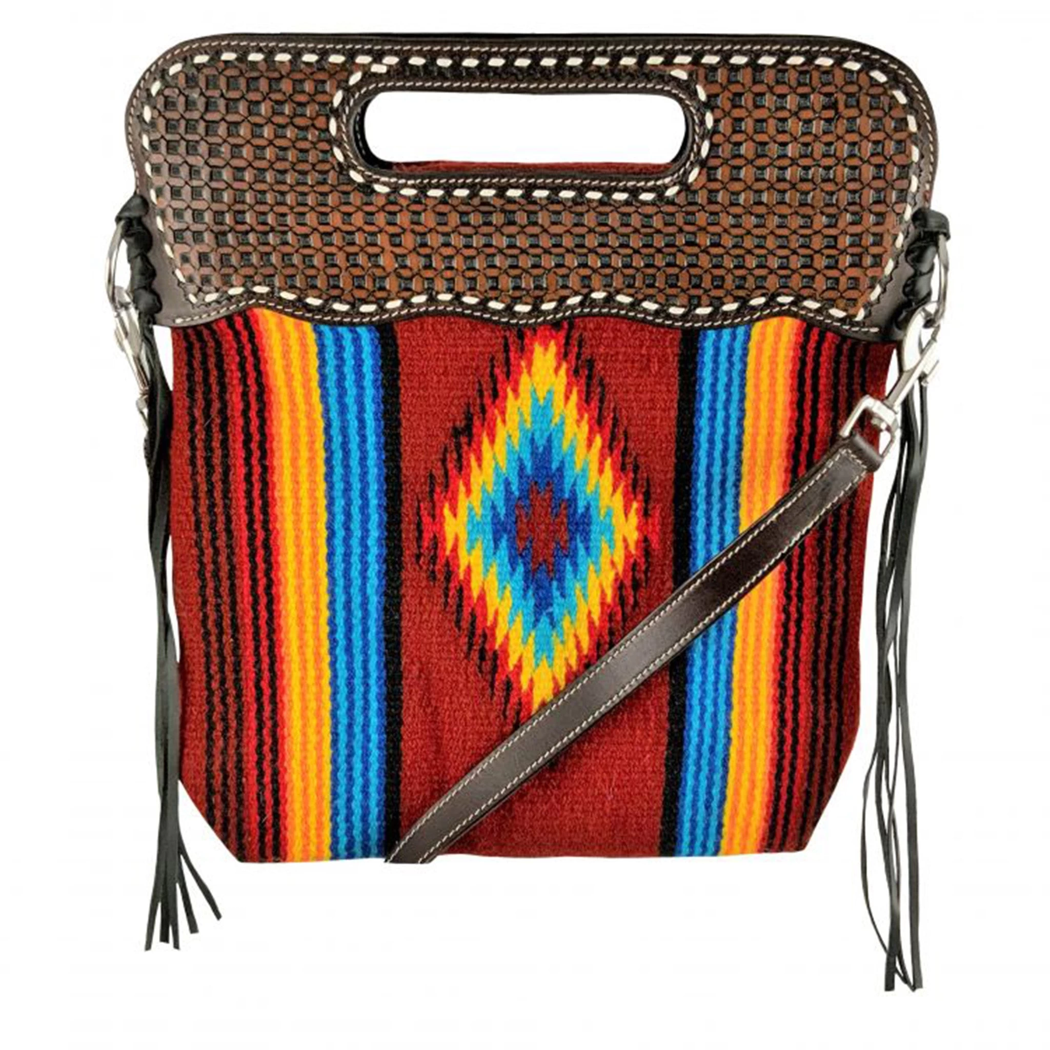 You will love this Southwest Saddle blanket handbag with genuine leather tooled handle. It is accented with painted white lacing includes carry strap, fringe and zip closure. This handbag is lined and includes an inside zipper pocket and adjustable shoulder strap.Â
