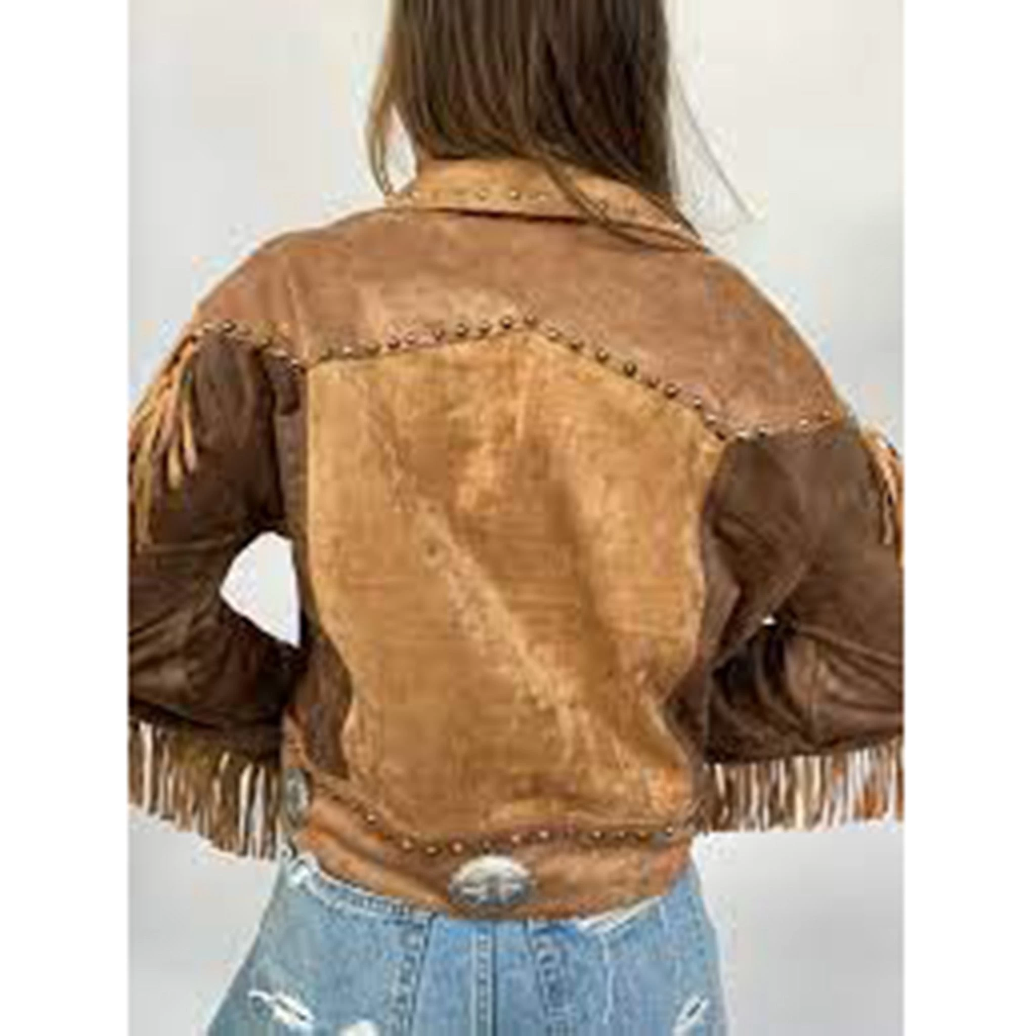Color blocked studded fringe suede jacket. Everyone obsessed with cowgirl fashion will need this jacket for their wardrobe.