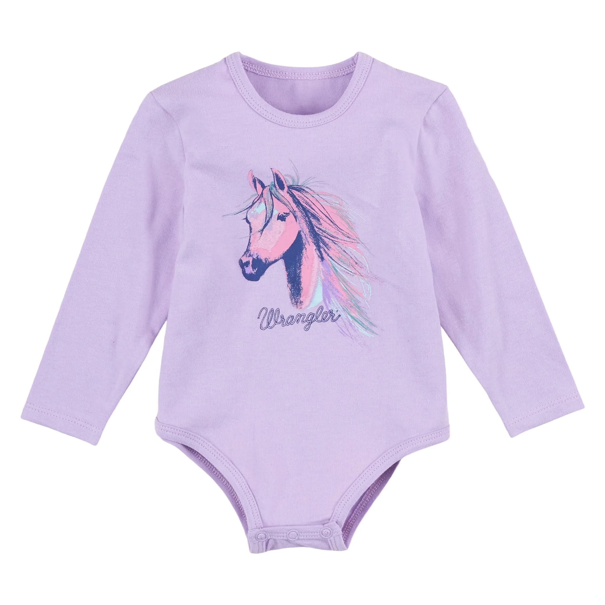 Wrangler brings you this sweet light purple baby girl onesie. This bodysuit has a pink and teal horse head screen print.