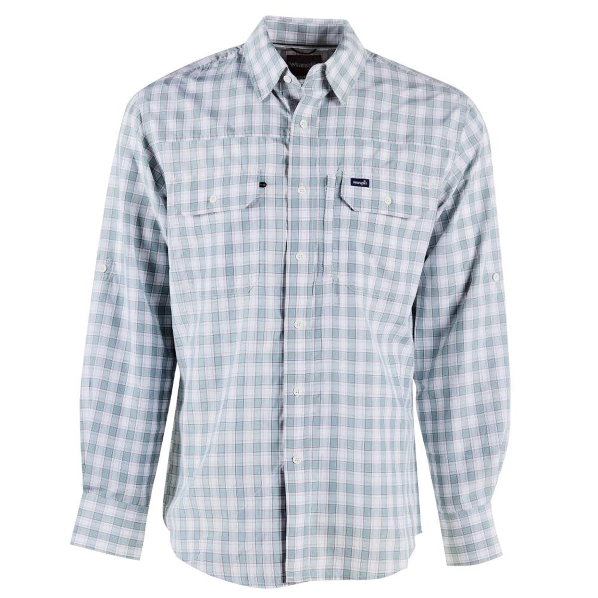 Whether worn on workdays or to special events, this blue and white plaid checkered long sleeve shirt by Wrangler is certain to upgrade any blue jeans or khakis in your closet.Â