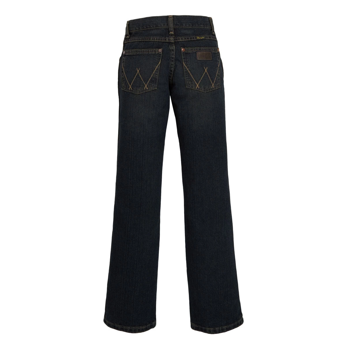Your young cowboys will look cute wearing these. They feature a dark wash color with a old fashion Wrangler patch on the back pocket. Straight leg with a relaxed seat, thigh and knee.Â